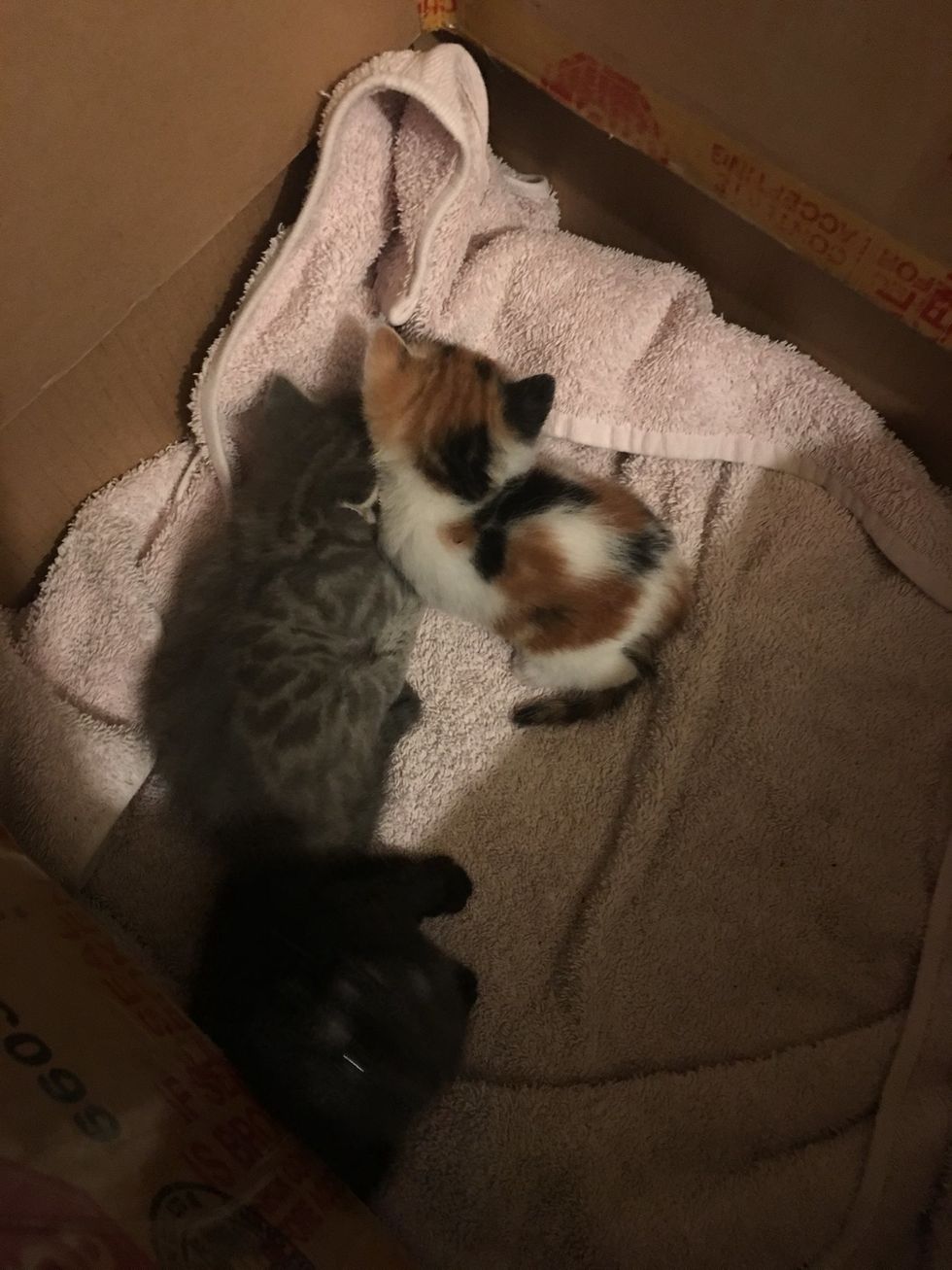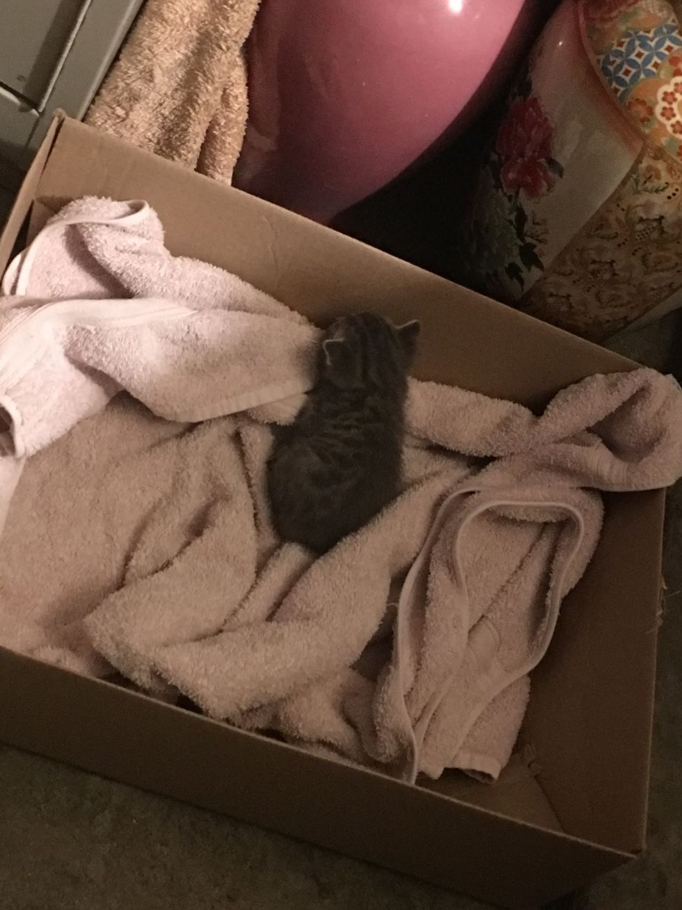Vincent, the home owner, has a soft spot for animals in need. He set up a makeshift bed with a large box and warm blankets for Mama Tala and her kitten.