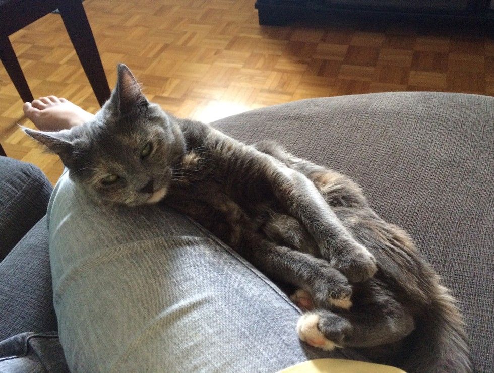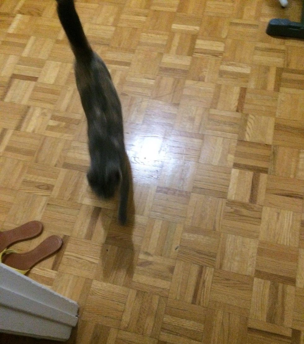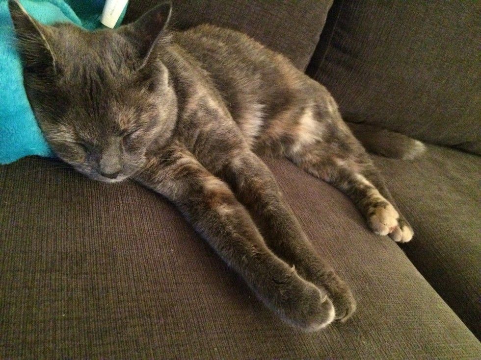 They opened the door, and she just sauntered right in. The scrawny cat walked around the house as if she was doing an inspection before settling herself in.