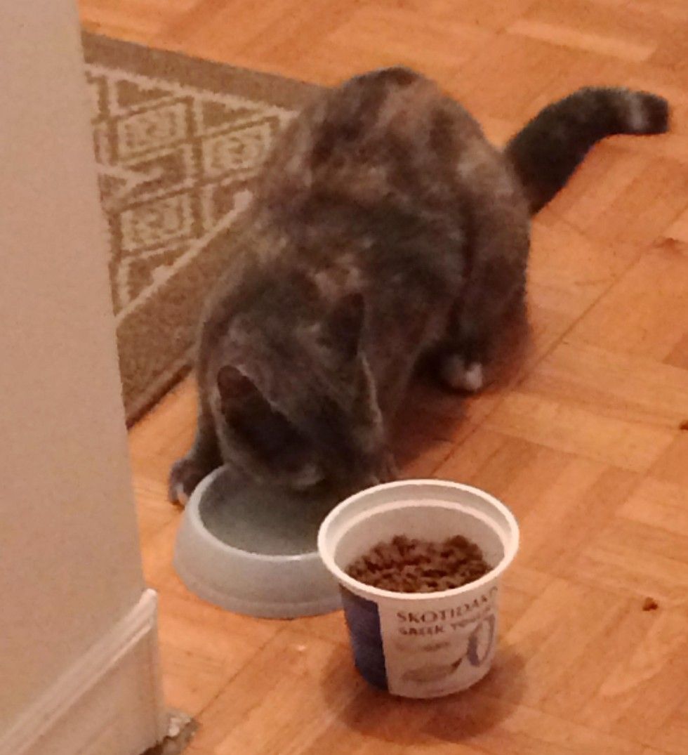 When they came back with the food, she was right there waiting to be fed. The kitty was so hungry that she finished everything they offered.