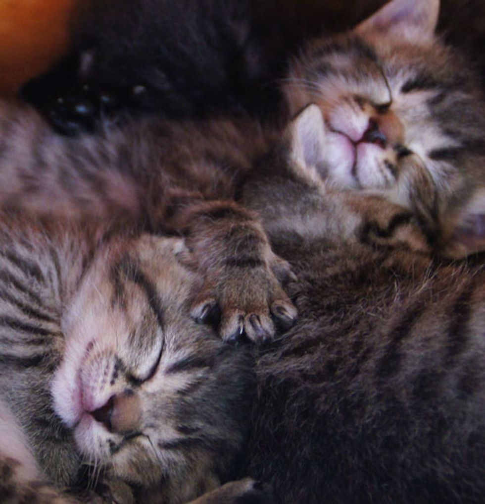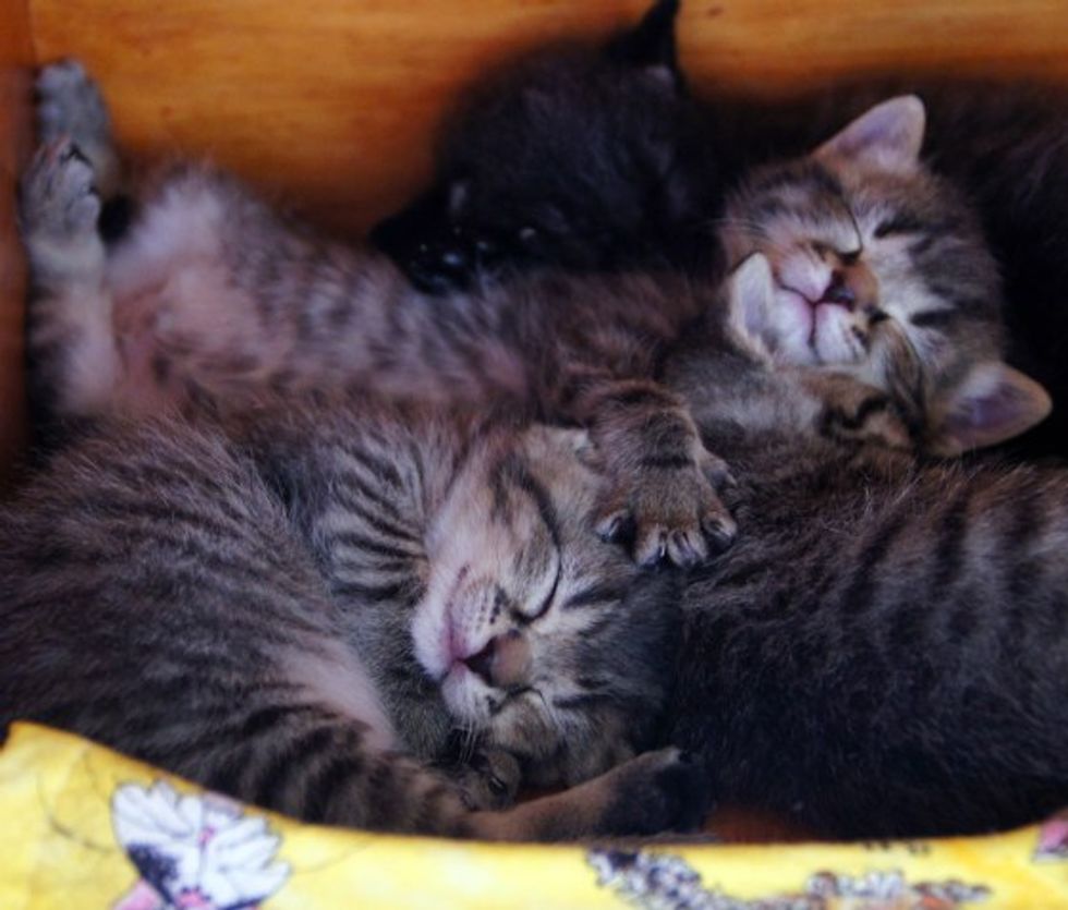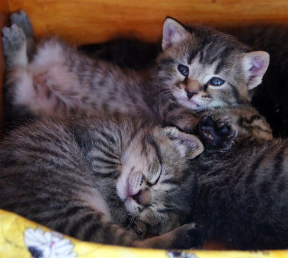 There is only one way to sleep comfortably for this tiny tabby foster. It is to cuddle up with her siblings.