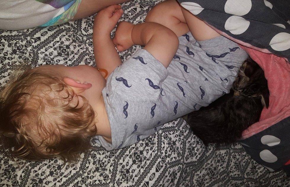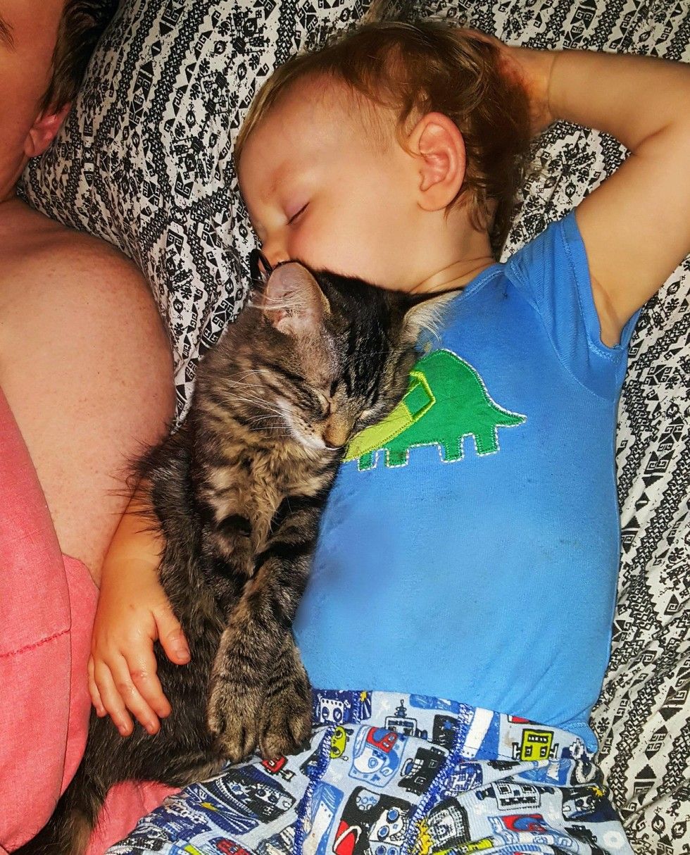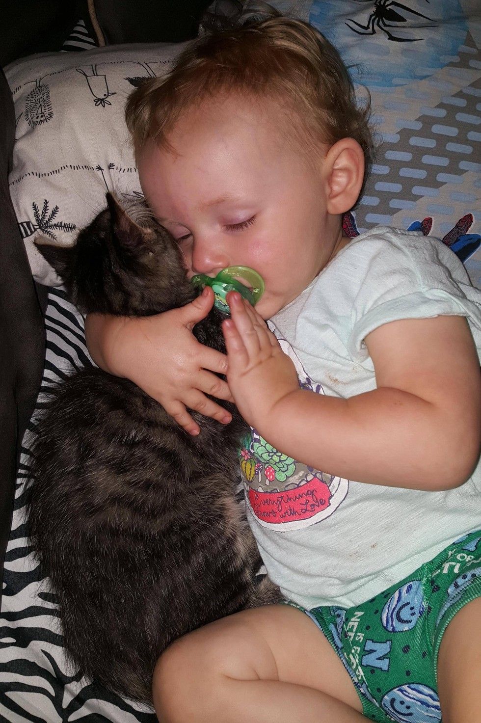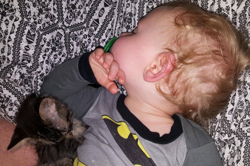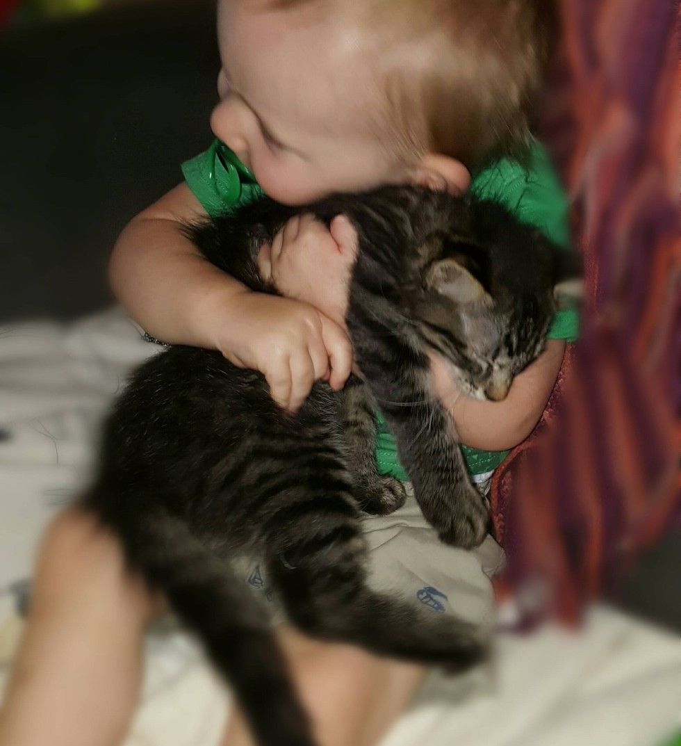 A family found a tiny kitten at the barn and brought him home. "I wish I had a video of me bringing him home, my son fell instantly in love with the kitty. It was the single sweetest moment I've seen. They've been inseparable ever since," the family shared on reddit.