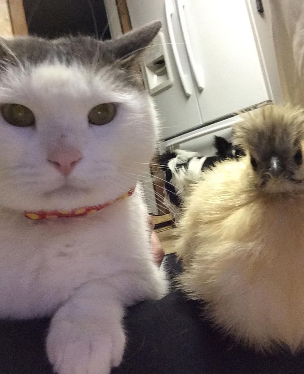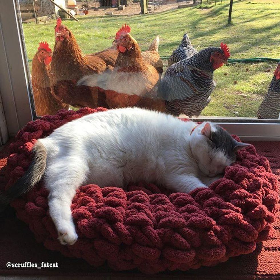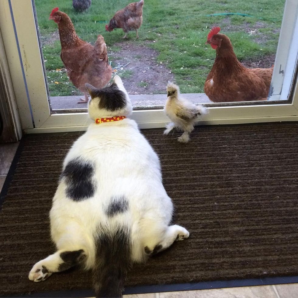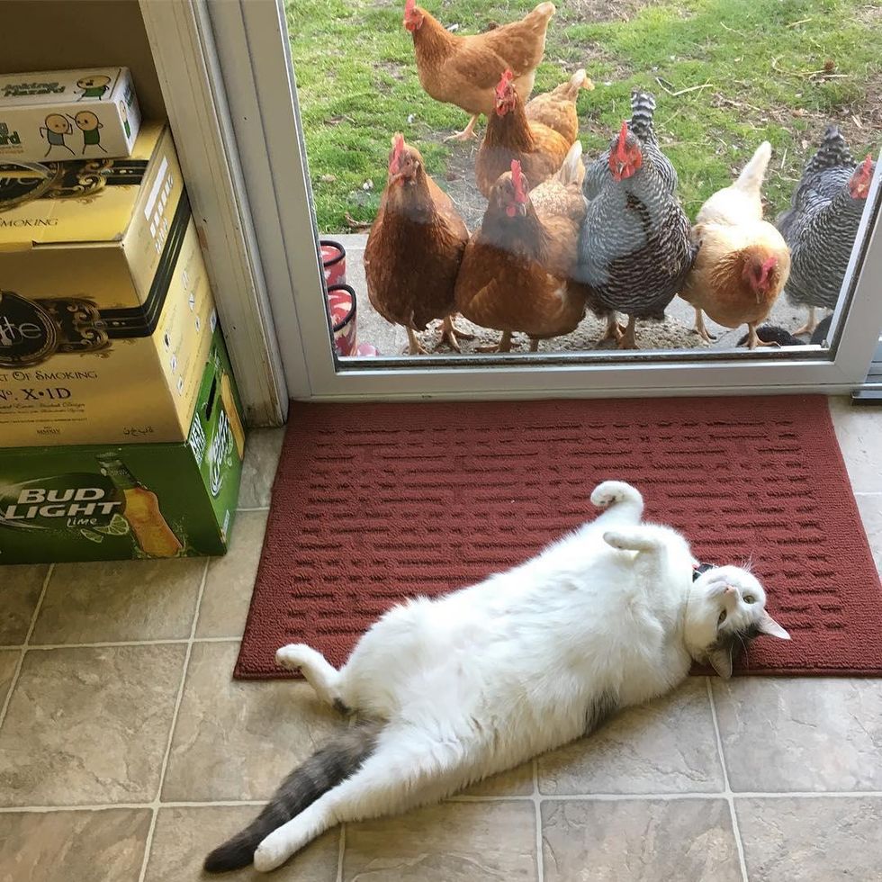 The chickens are fascinated by the laid back kitty and often line up by the glass door, watching him pose and admiring his fluffiness.