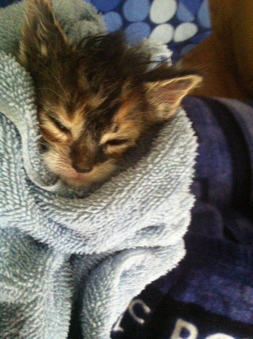 "This is just after her last of three flea baths- she didn't cry or fight with us at all, she was just too tired."