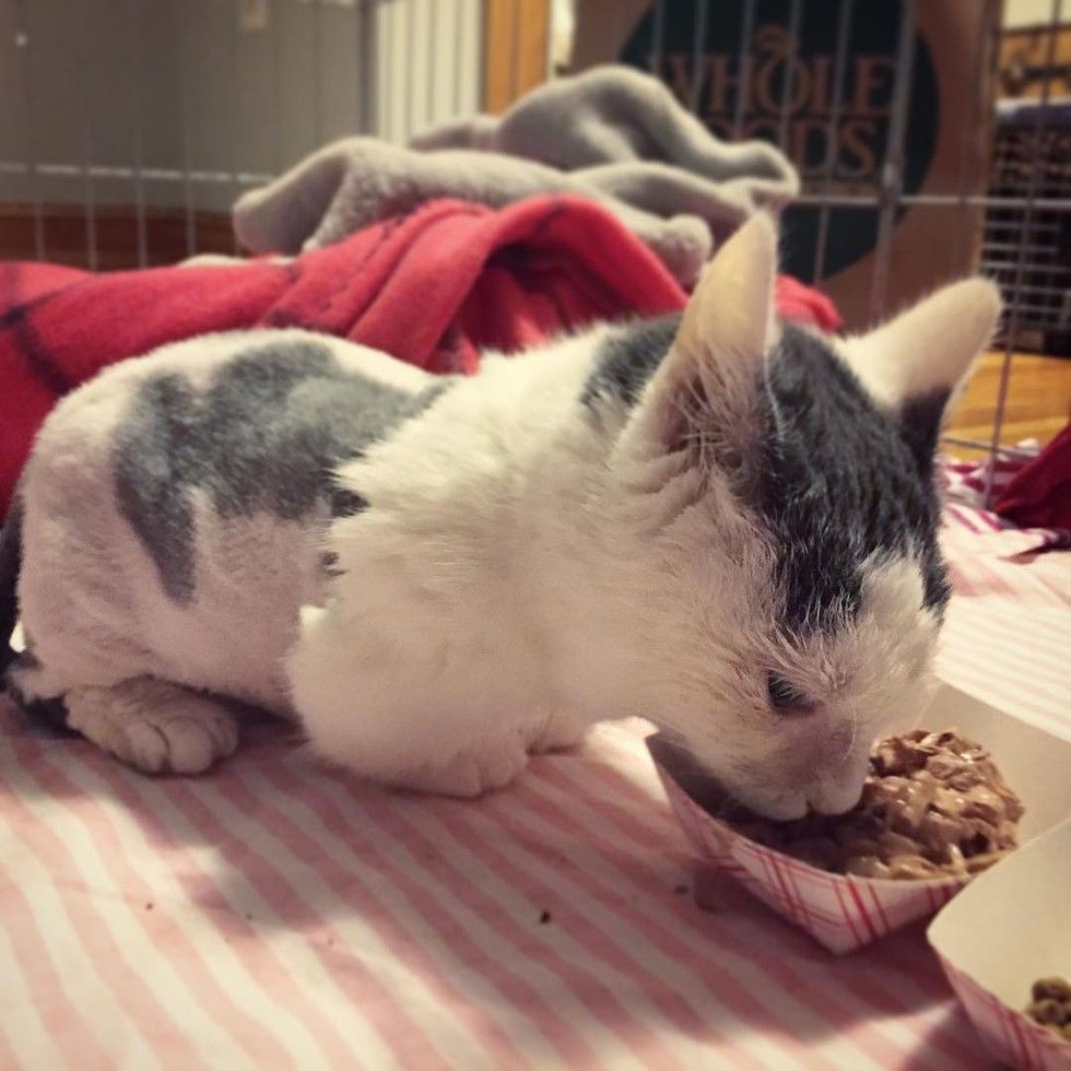 They took her to a foster home, and the little wonder cat was so happy to have a warm bed and all the delicious food. She flopped over to show her happiness.