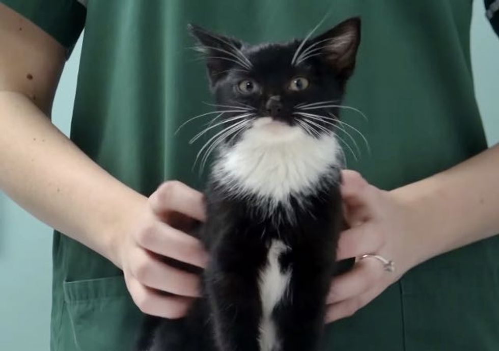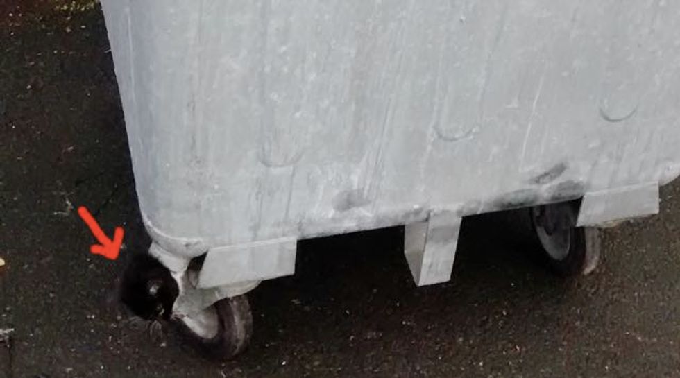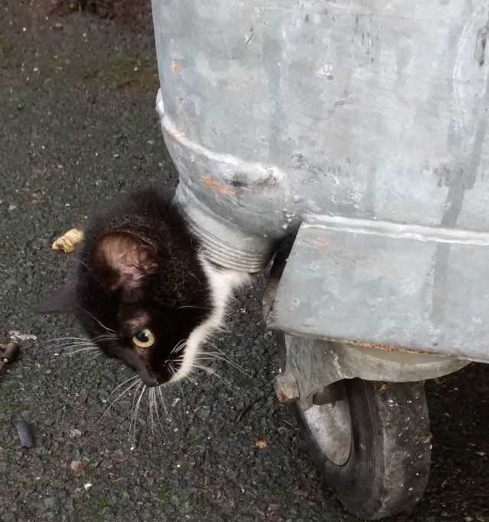 A tiny tuxedo kitten got herself in a bit of a pickle when she was found stuck in an industrial bin with her head poking out.