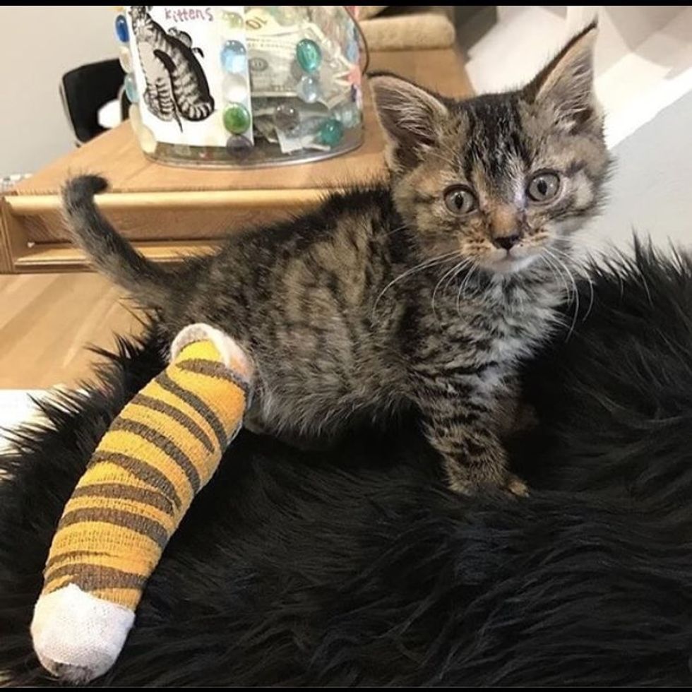 No one knows how long she was stuck in the fence for, but the little tabby fought hard for survival. "Her little paws were all raw from trying to free herself, and her hind leg, although not broken, had suffered severe nerve damage from her accident."