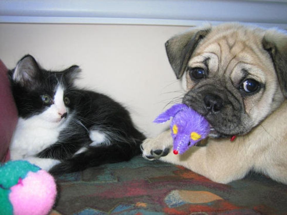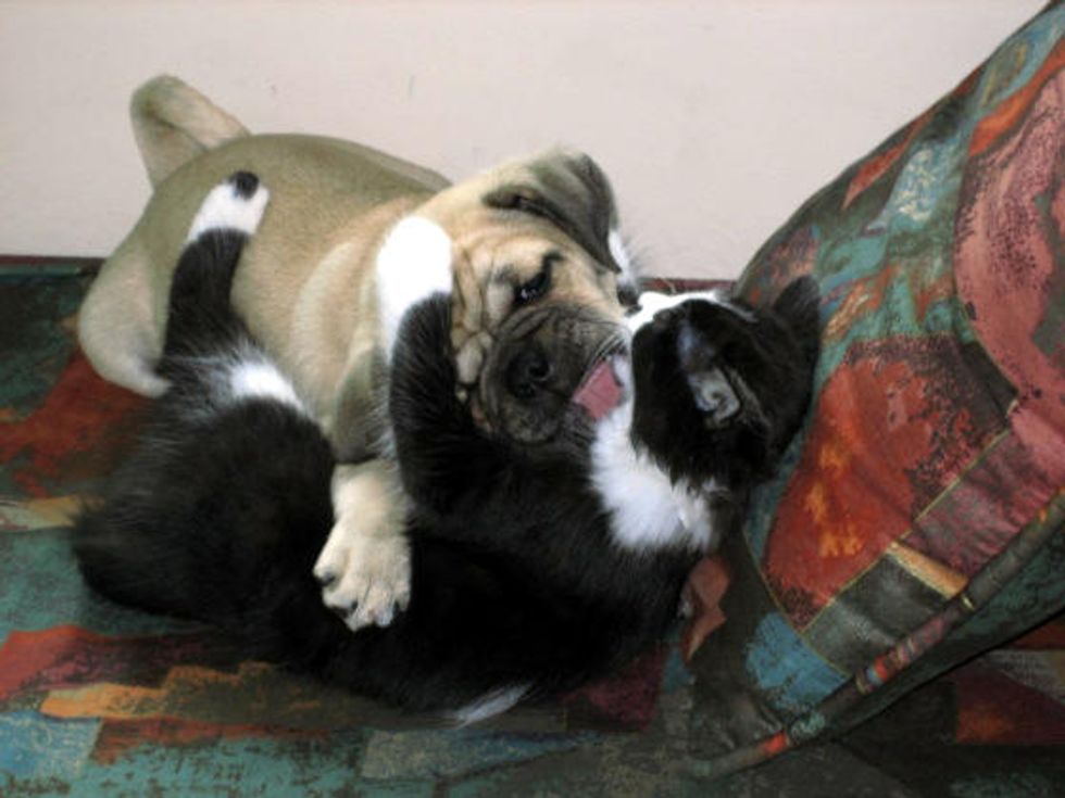 Bubble the cat and Lola the dog have the perfect friendship. Bubble shares everything with Lola and Lola clings to Bubble.