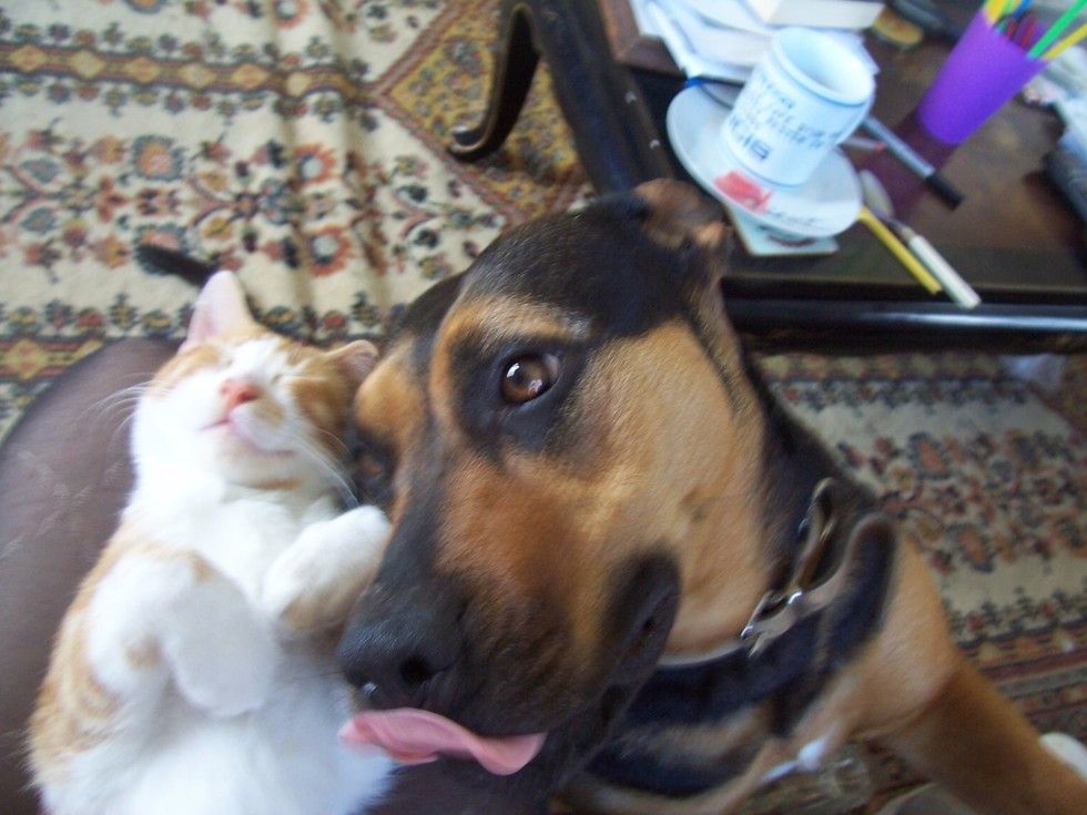 "Vicky, my Beauceron/German shepherd has become very maternal since the kittens moved in. I don't know if that is because she was abandoned too... but she will often plonk herself down next to them and clean them."