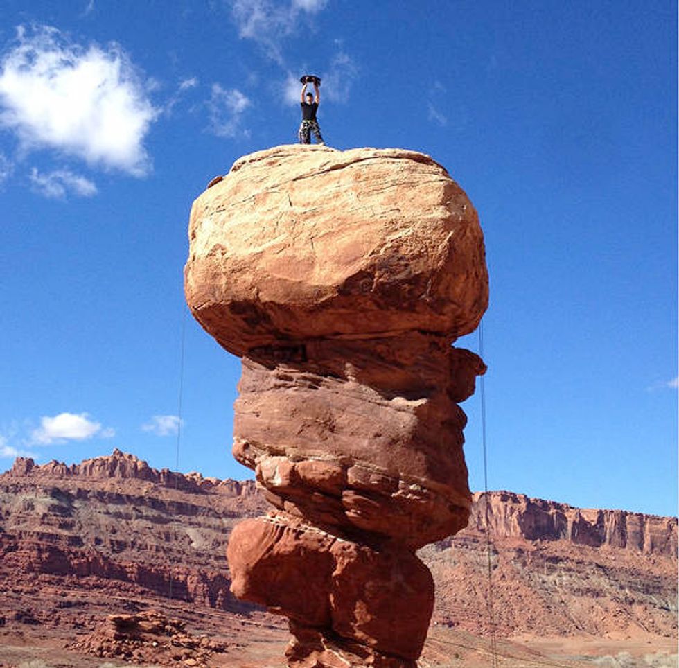 Millie celebrating a successful aid climb of Devil’s Golf Ball in Moab.