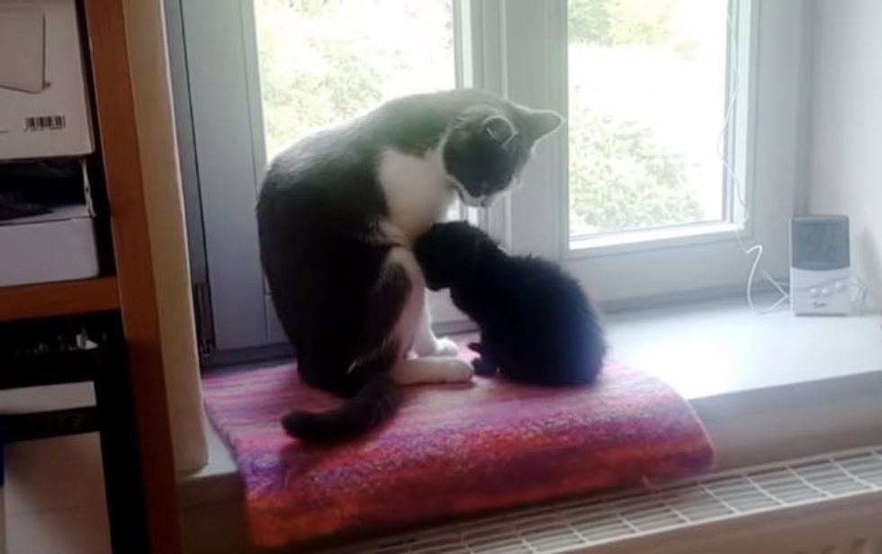 They adopted a homeless kitten. This is the little kitty trying to bond with their family cat.