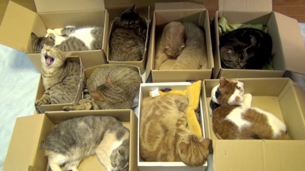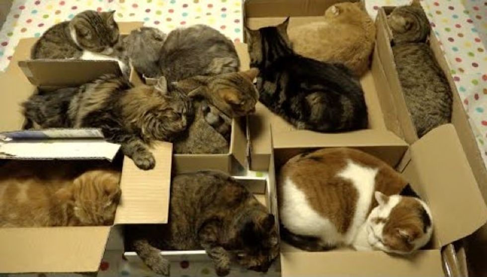 These 10 kitties decide to have a slumber box party when their human dad pampers them with a collection of cardboard boxes. Some cats prefer smaller abodes while others enjoy more spacious options.