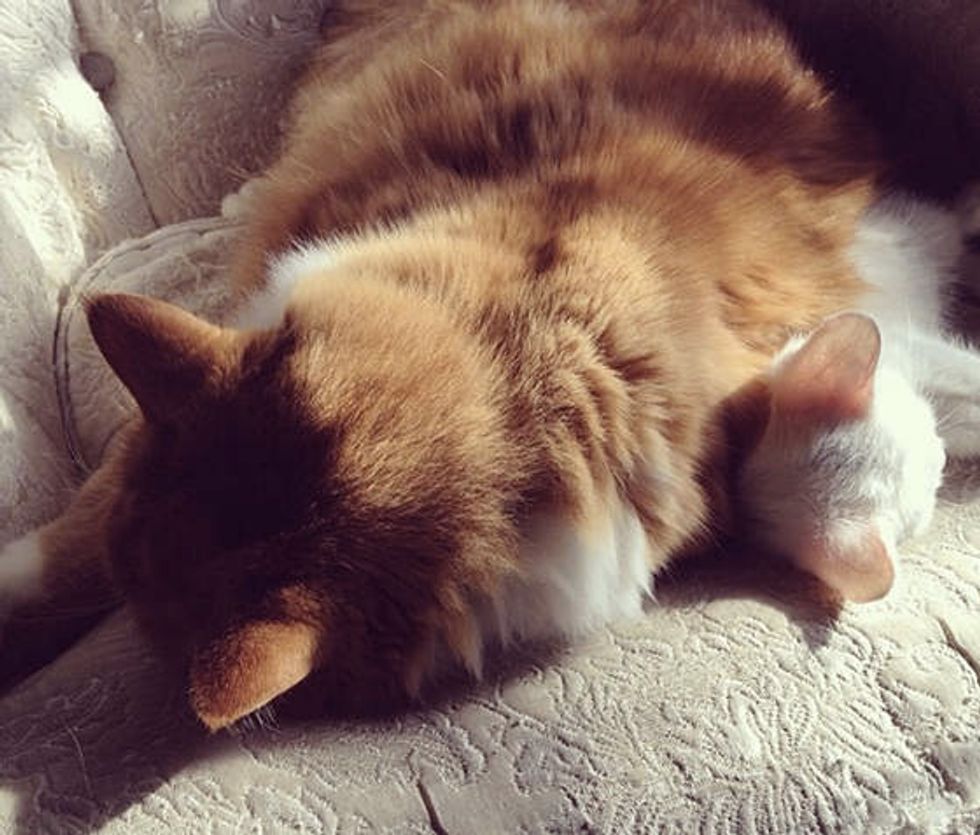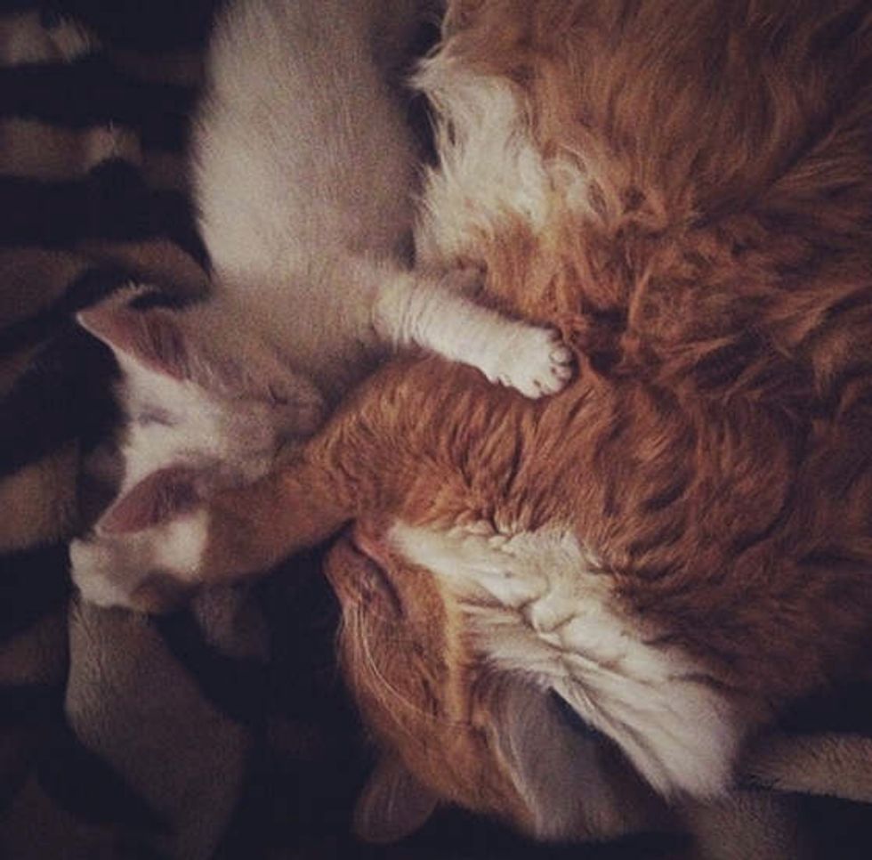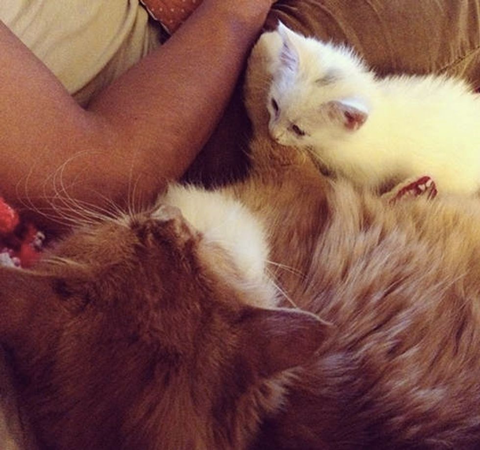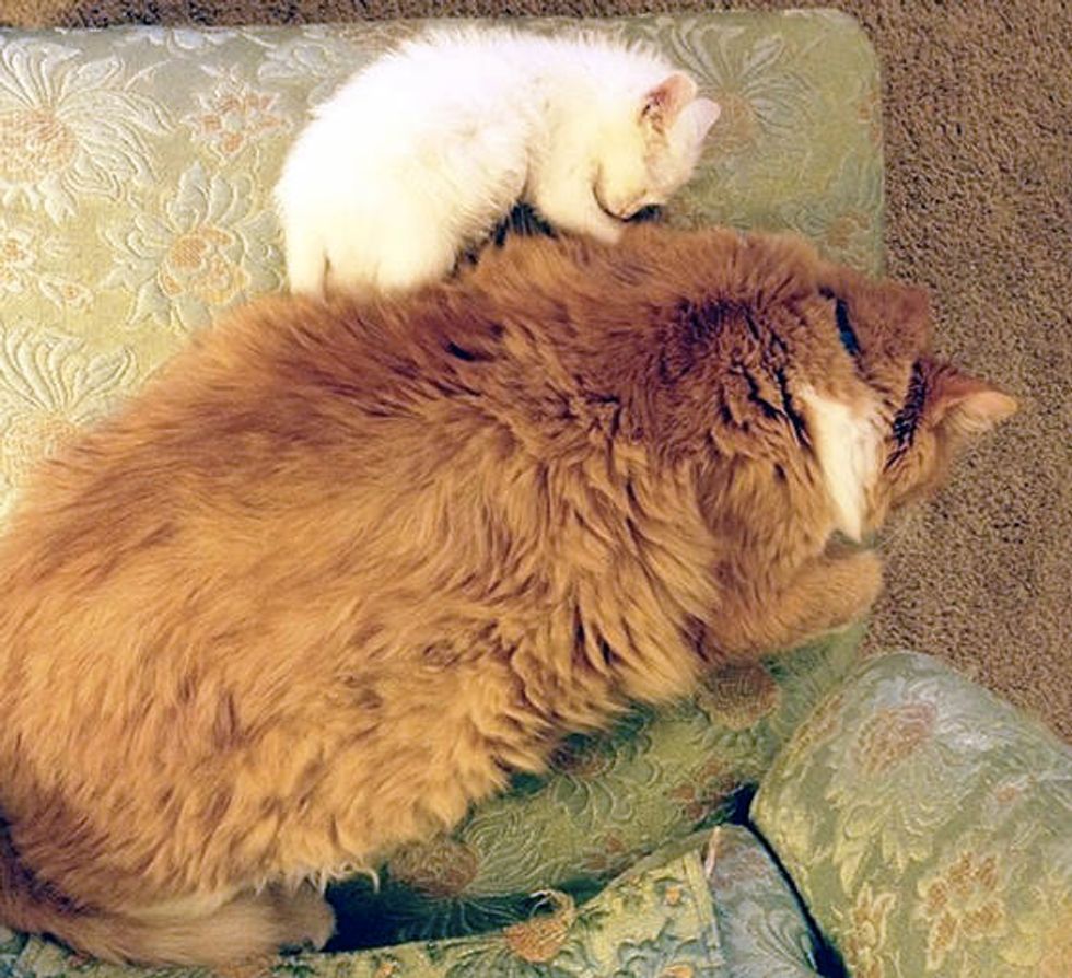 Zorro showers the two kittens with a lot of love and care. He snuggles with the kittens to keep them warm and comfy. Skippy and Meowstache loves to cling to their gentle ginger cat like how they would to their cat mother.