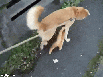 A dog has adopted a few feline friends and raised them since they were kittens. They snuggle together, eat together and even take on walks together. The kitties follow him around when their human walks the dog.