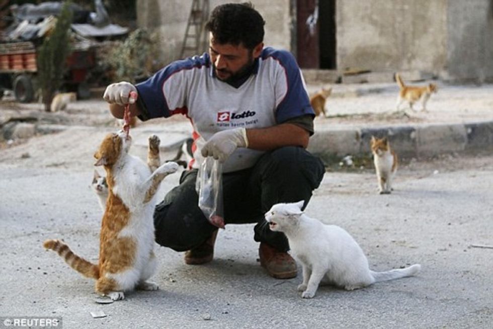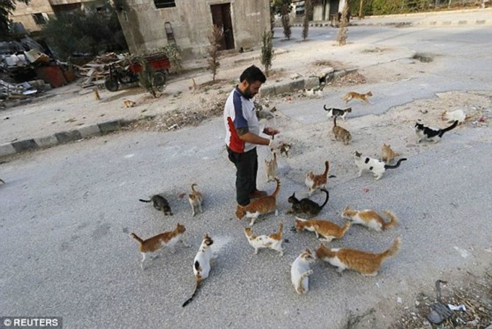 Ambulance driver Alaa feeds stray cats every day in his neighbourhood in Aleppo as civil war rages around him.