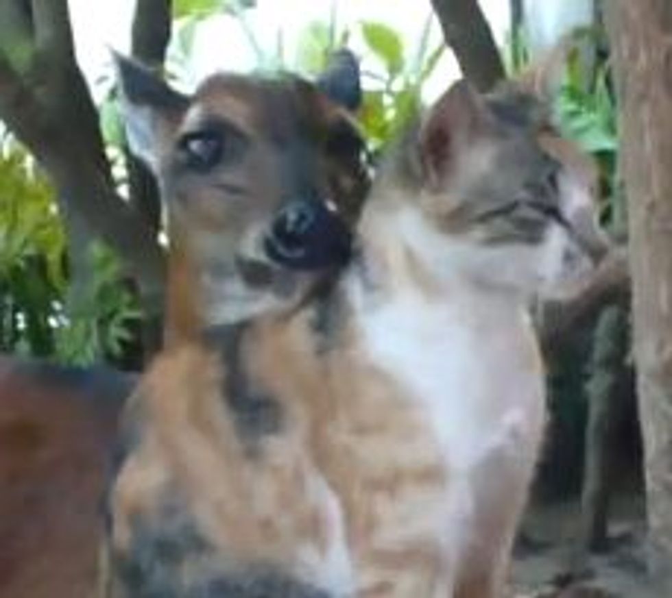 A calico cat and an antelope are frequent visitors to the Royal Hotel restaurant in Monrovia, Liberia where they get food everyday. The two found each other and are seriously bonded buddies.