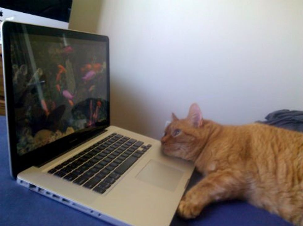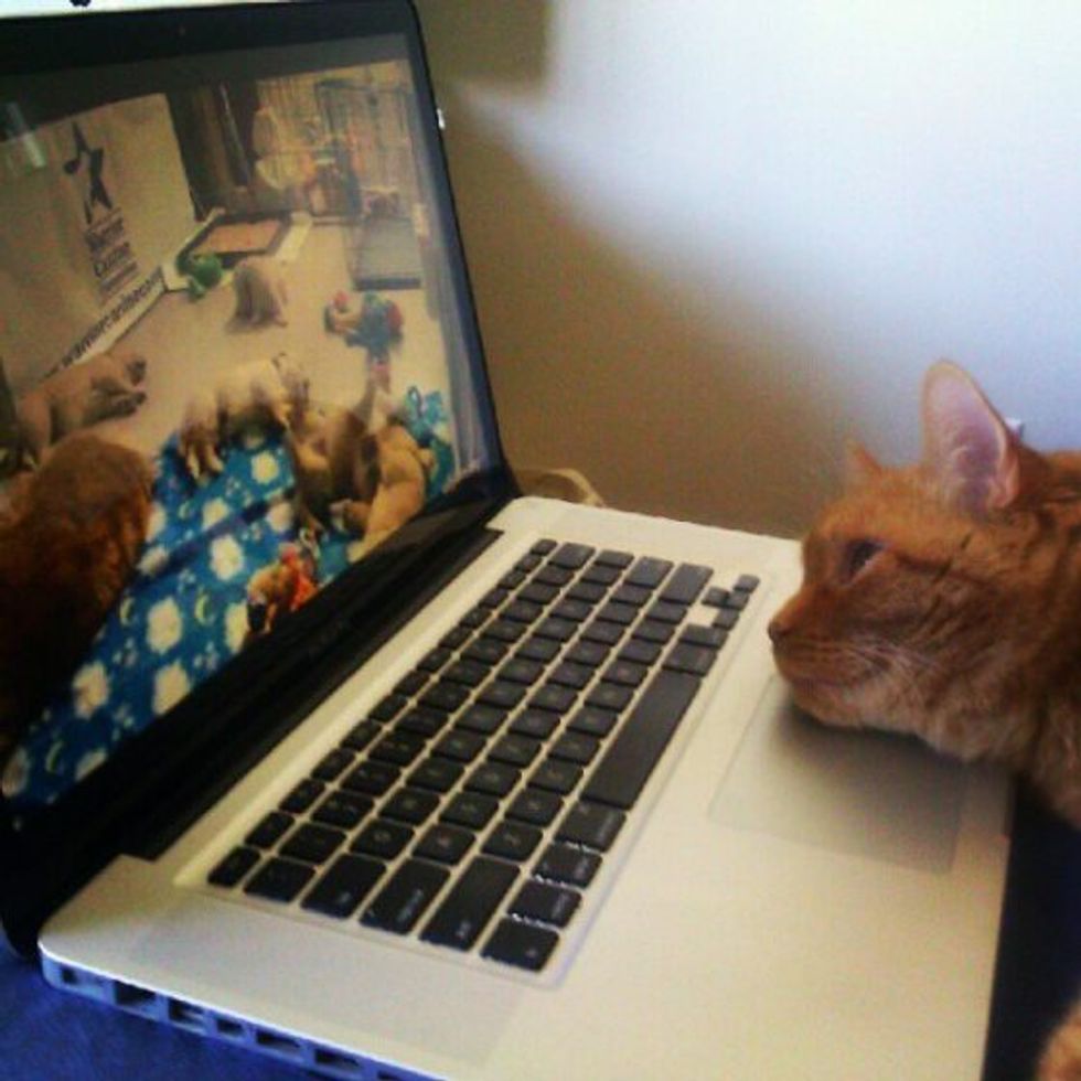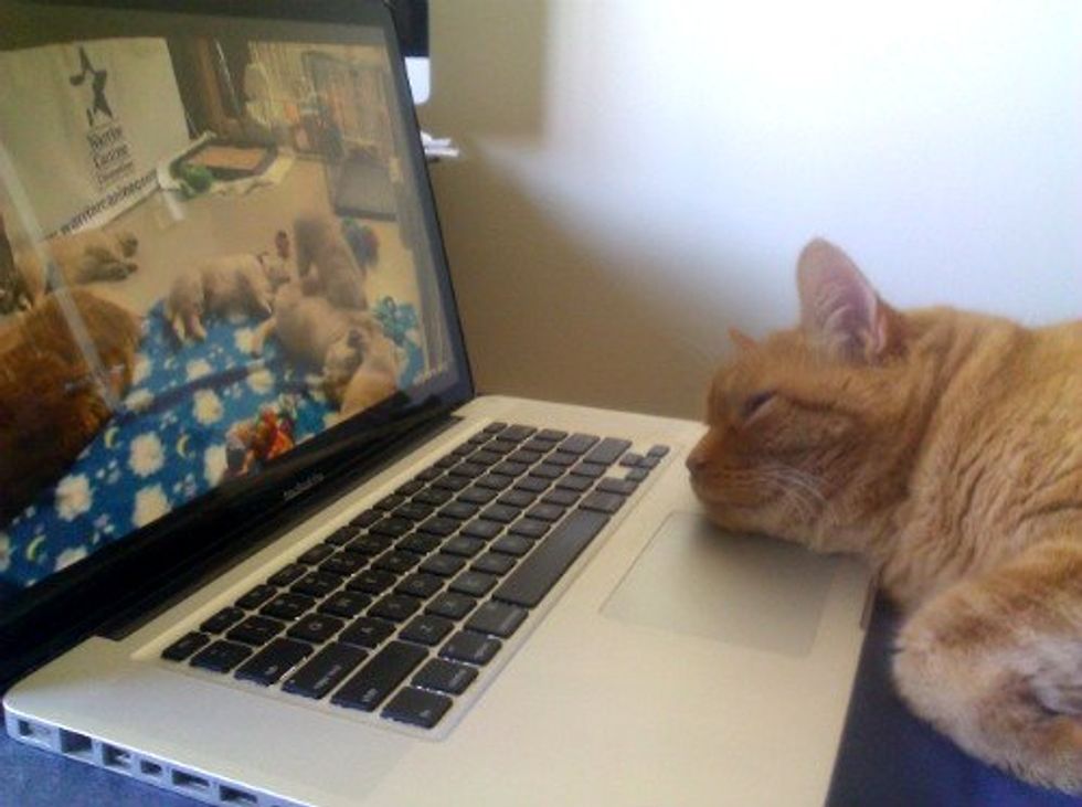 Baba the cat has a special hobby. He likes watching a live feed of golden retriever puppies on the computer.