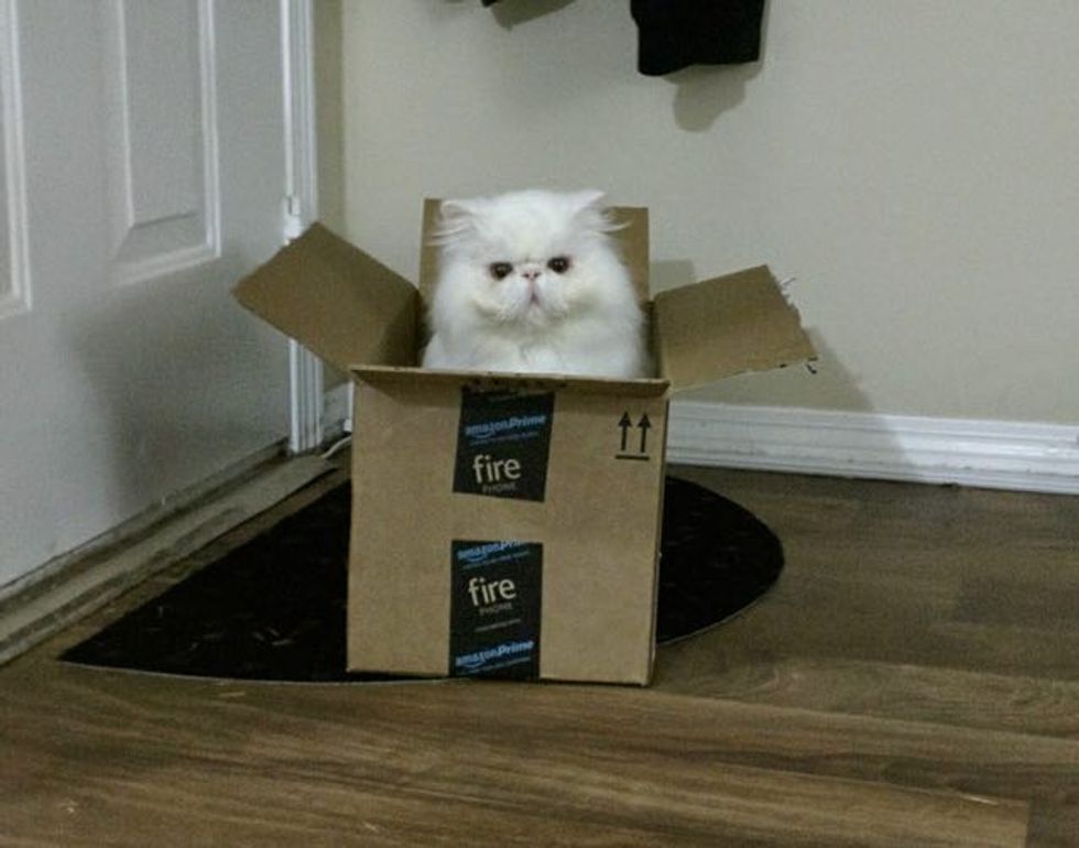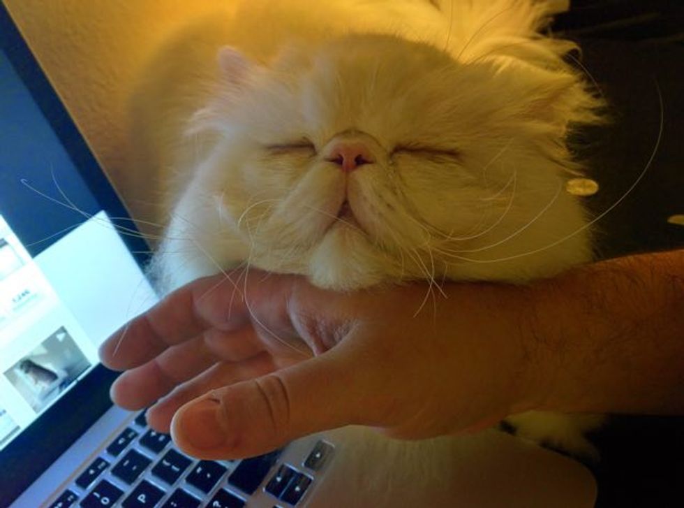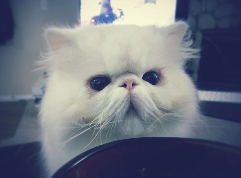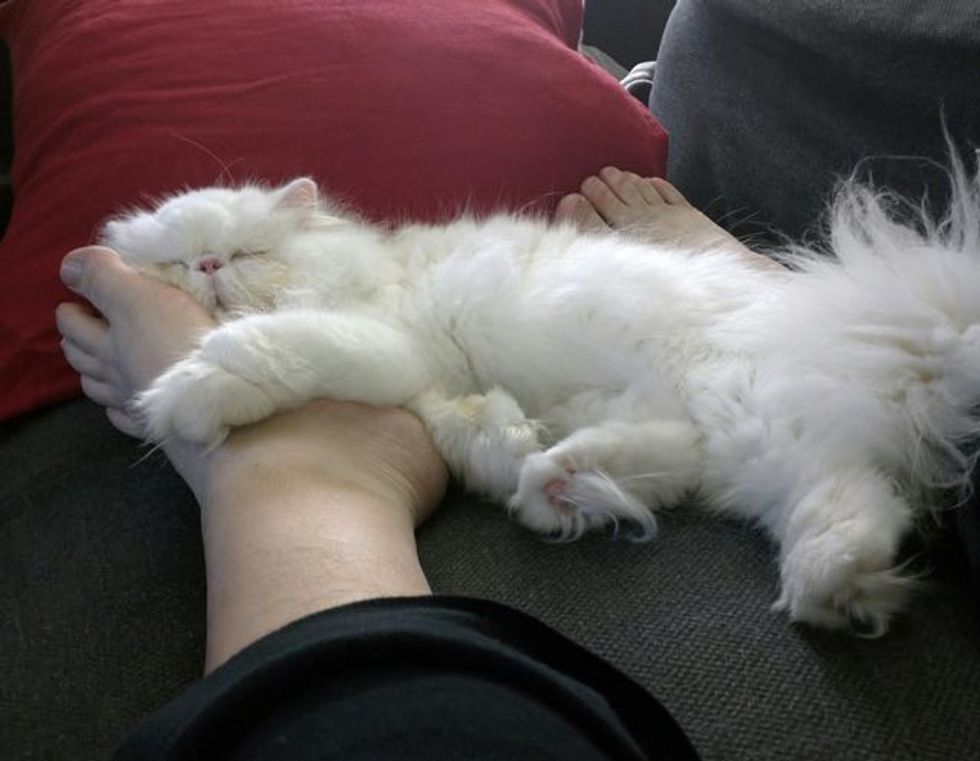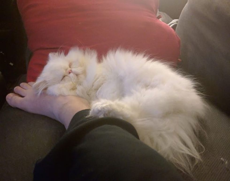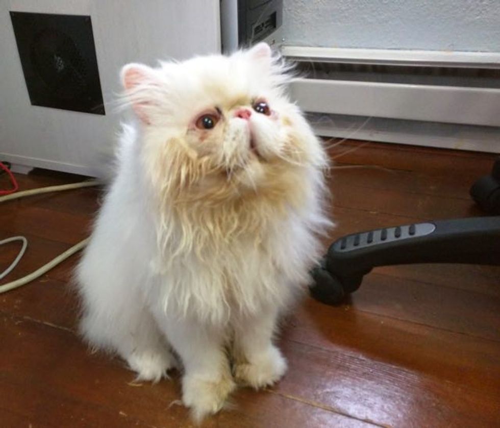 This fluffy white Persian cat was rescued from a neglectful breeder. When he was very young, he had eye problems requiring surgery. After he could open his eyes again, he met his foster dad. It was love at first sight.