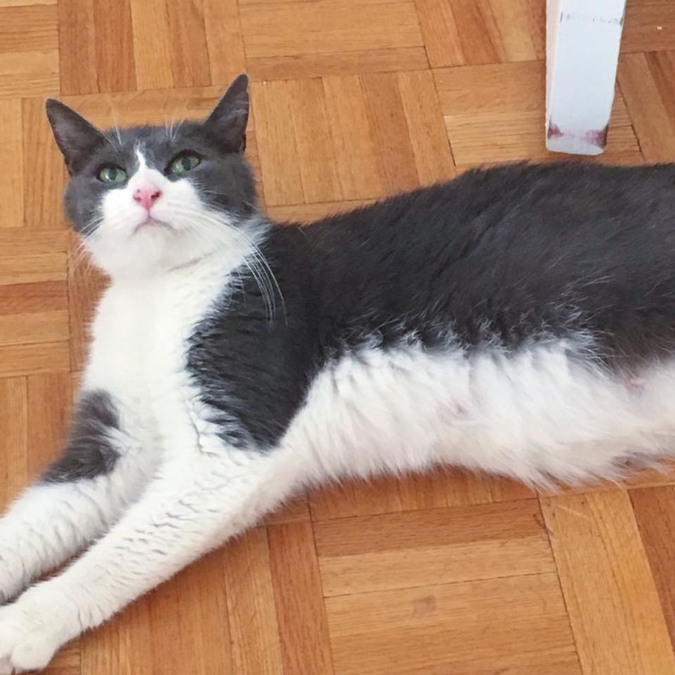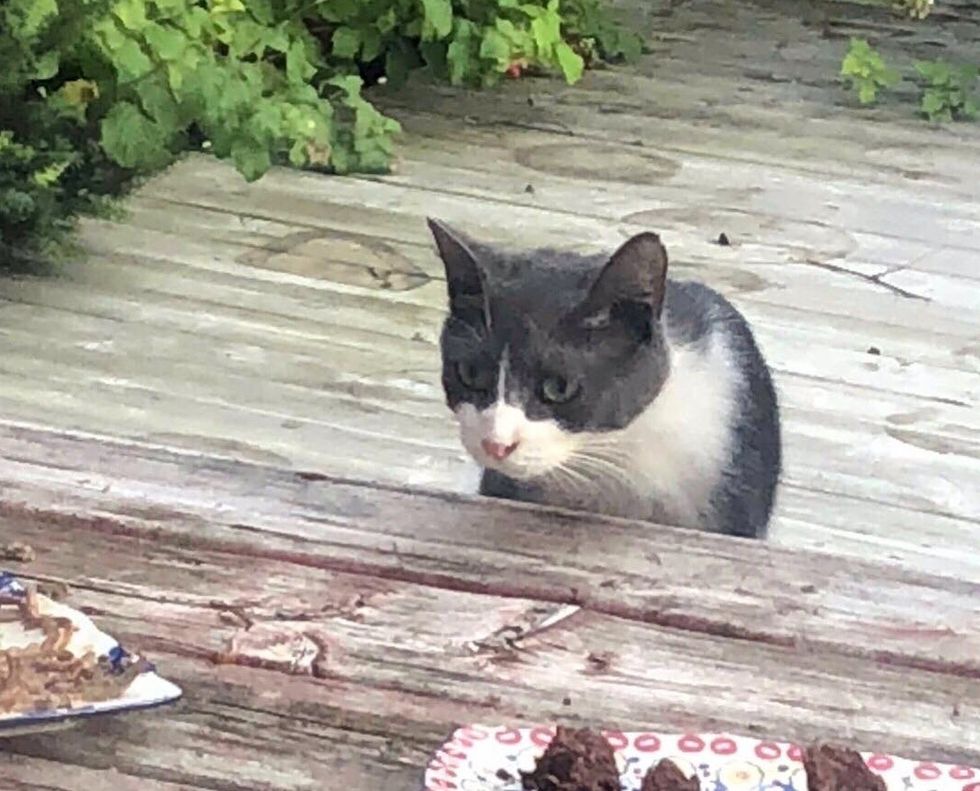 Earlier this year, a gray and white cat wandered by their home, looking for something to eat. She was very shy but too hungry to resist the food the family offered.