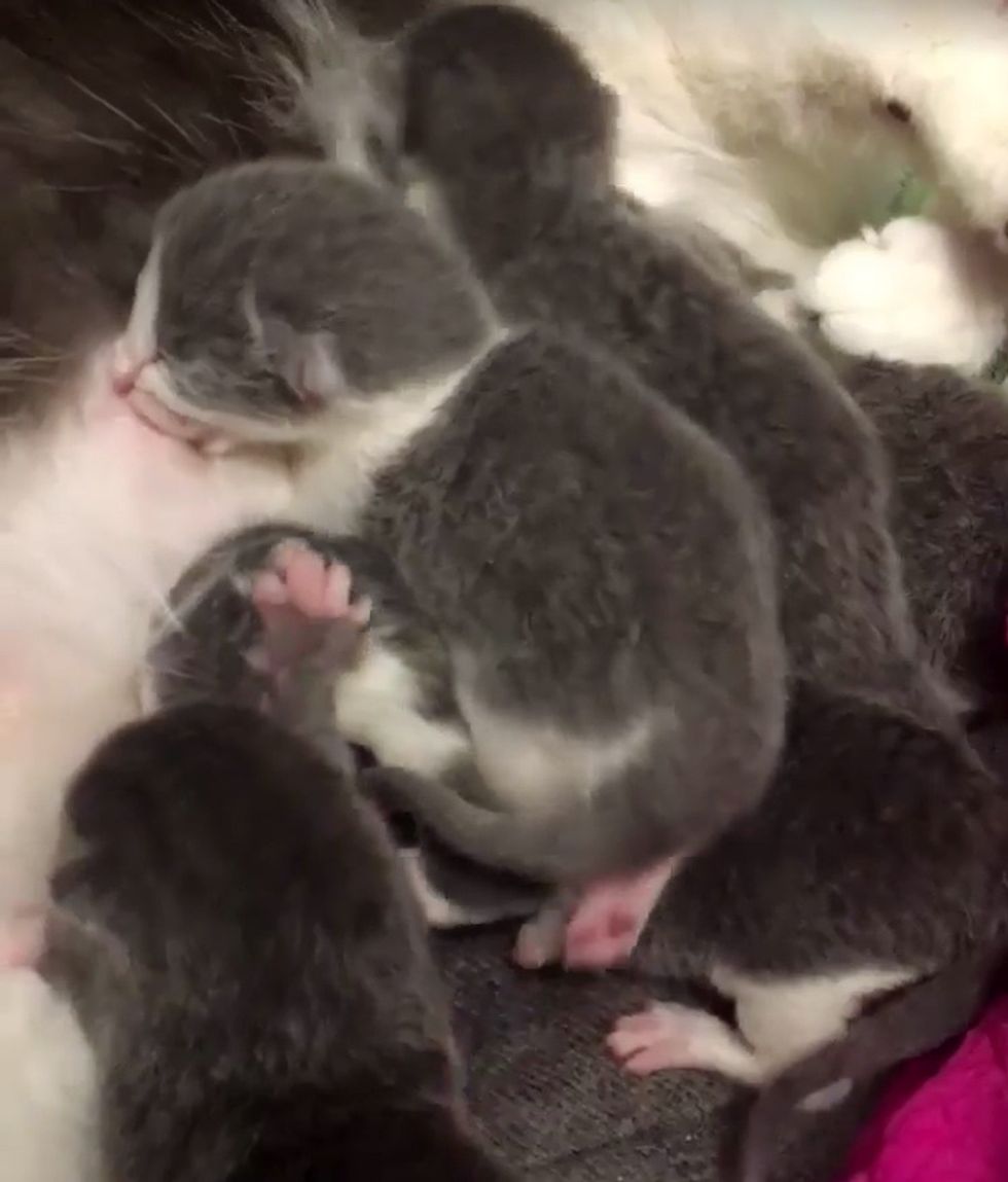 The momma cat gave birth to a litter of five kittens who looked like her tiny mini-mes.