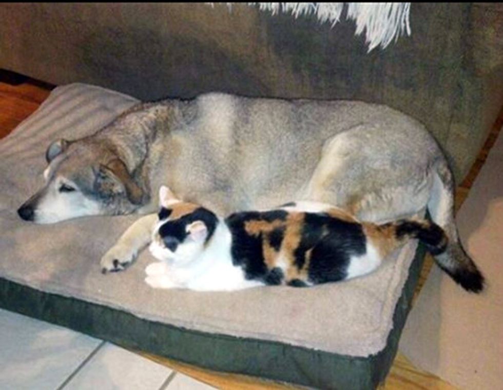 Sometimes Buster would whine all night, but Kitty always comes to the rescue. "Its amazing... She usually sleeps with my sister but Buster would whine all night, so she started sleeping with him," said their human on reddit. Kitty is like Buster's little guardian angel, watching over him and comforting him. Maybe Kitty can sense that sometimes Buster is in discomfort so she purrs to help calm him down.