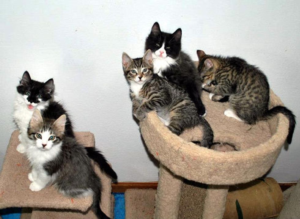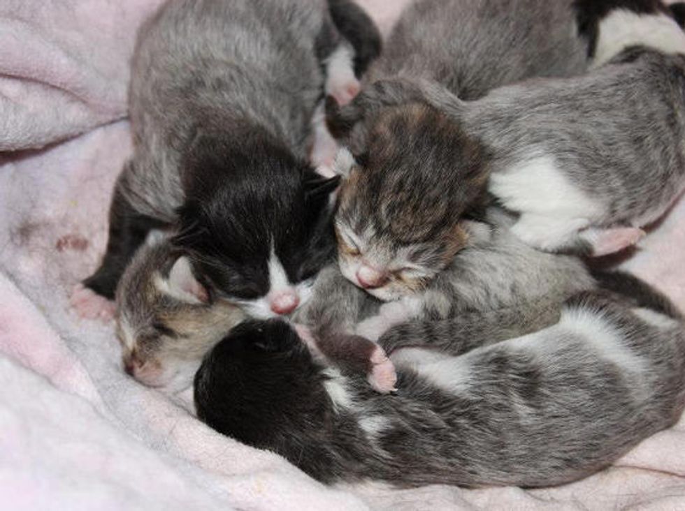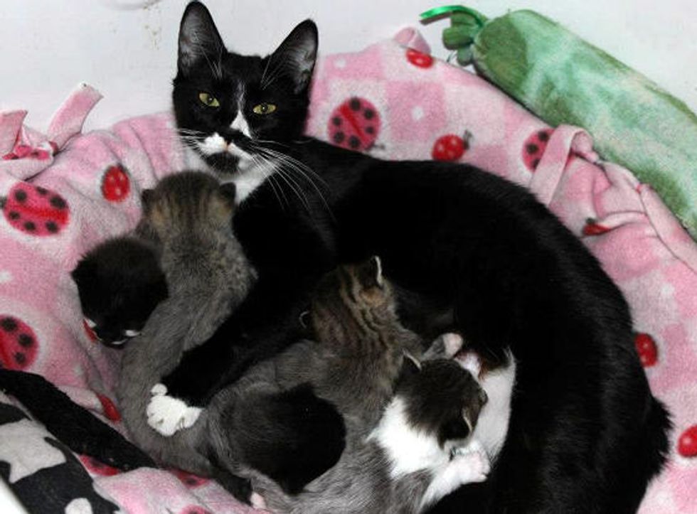 Ripley is a good mom, caring for her 5 very demanding kitties