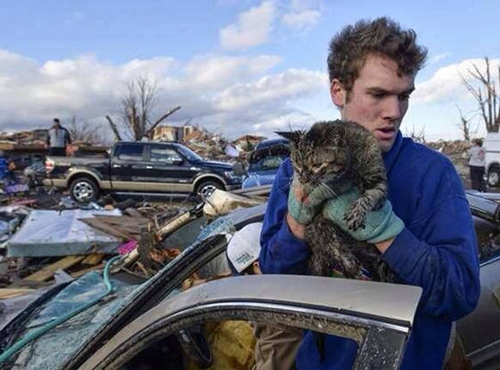 "This cat was discovered in the rubble and was reunited with its owner." (Do Something)