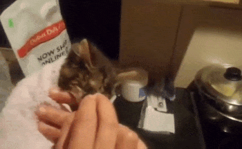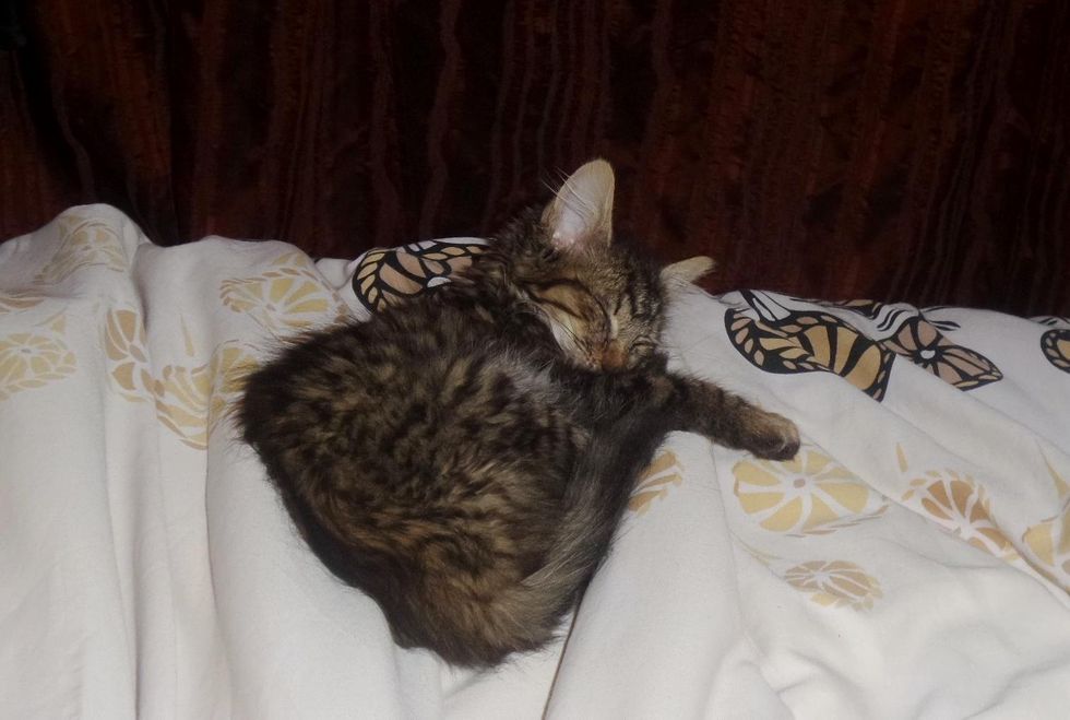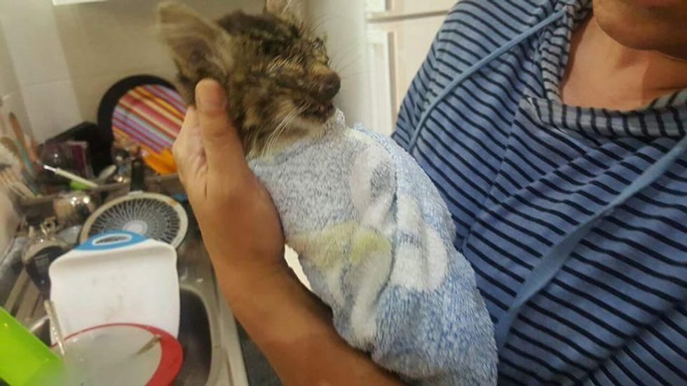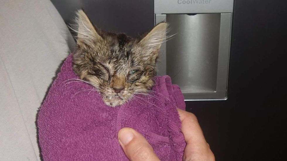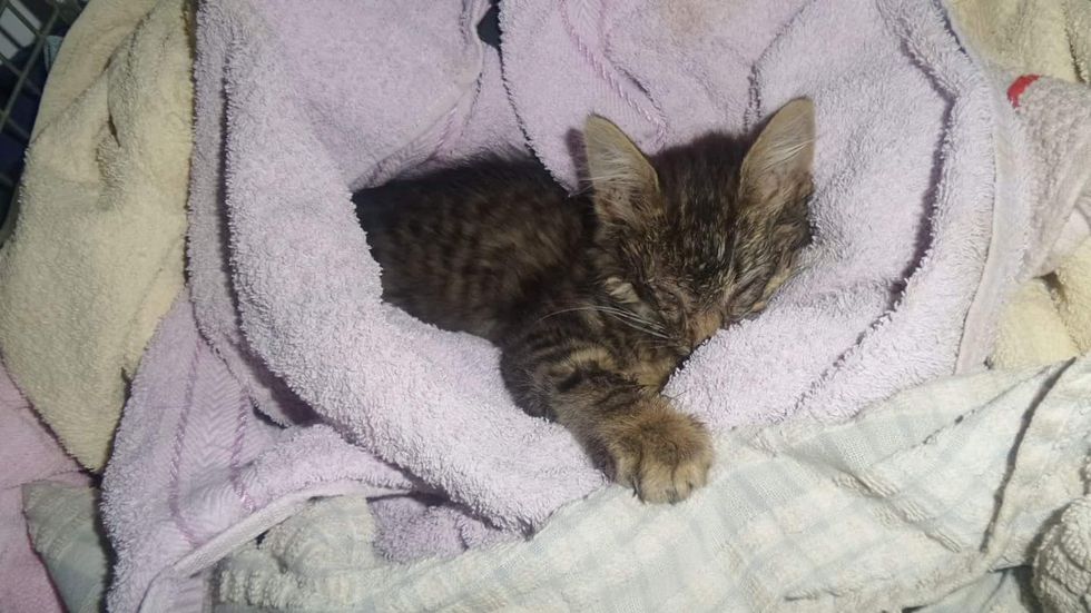 After cleaning and feeding through a syringe, they wrapped her up in a towel, and the sweet tabby fell asleep in it. "A makeshift hospital bed for the little bug. She was already looking so much better!"