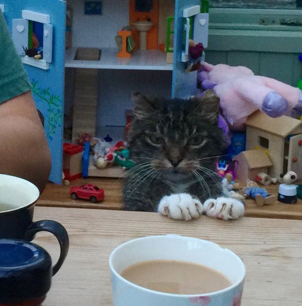 Tumble the cat comes to sit by the dining table every time his humans eat. He's been doing this for 19 years.