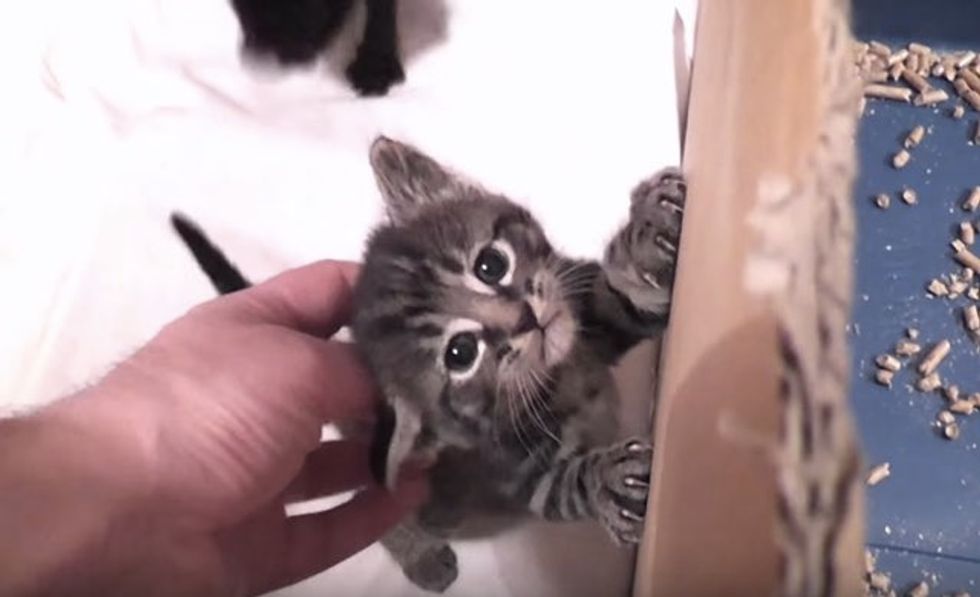 While mama cat Kami is taking a break from nursing, all the foster babies insist to have their foster dad Doug in the pen for some play time.