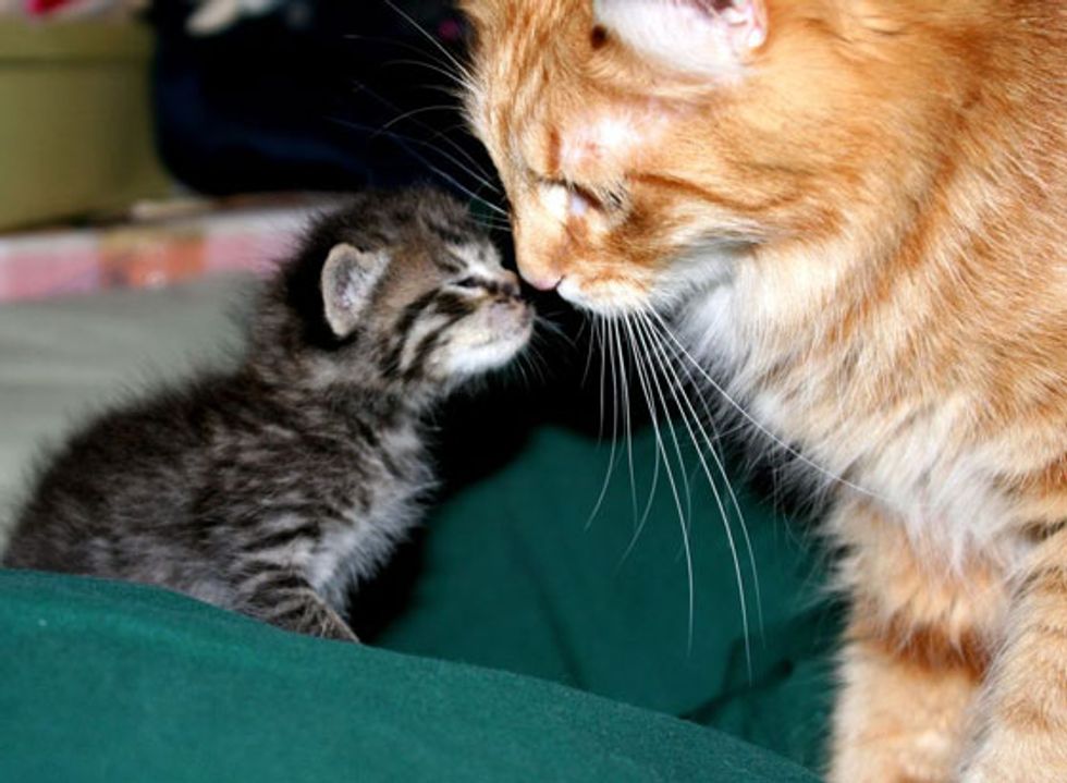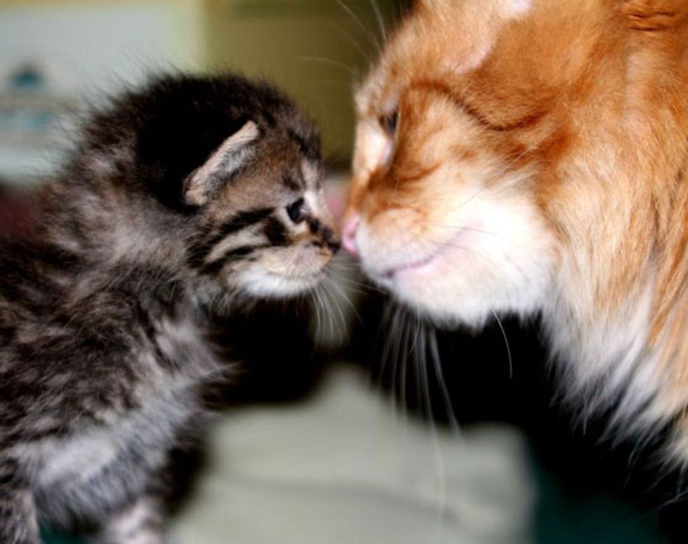Milla welcomes a new foster kitten into their home. As a rescue herself, Milla knows exactly what to do to keep the little buddy feeling like at home. She walks up to the kitten and offers a gentle nose kiss.