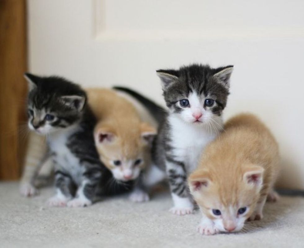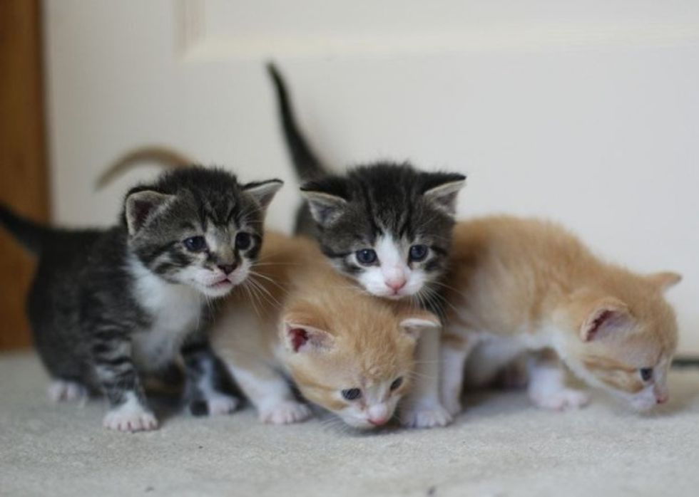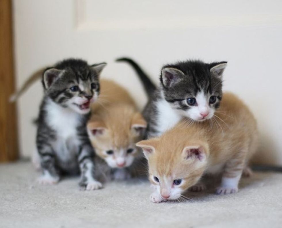 Four wee foster kittens are exploring around for the first time. They stick together in a pack wherever they go like a cute furry troop.