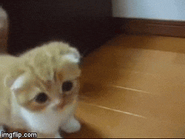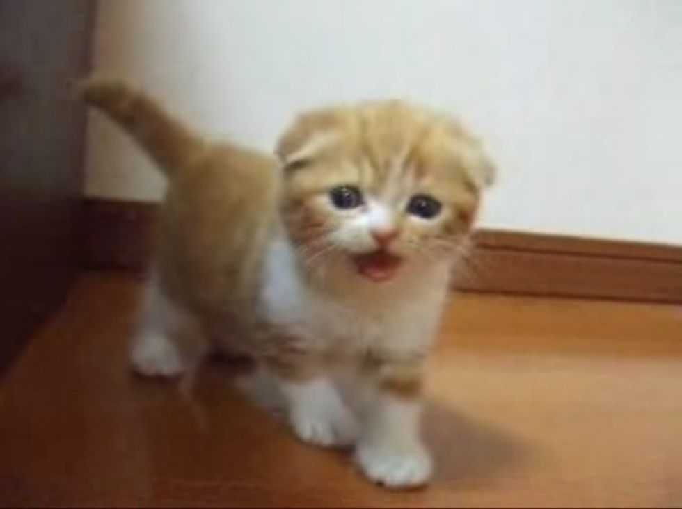 This adorable Scottish Fold kitten is following his human around while exploring every corner of his home, waddling about with his poofy tail up. This is the next level of cute.
