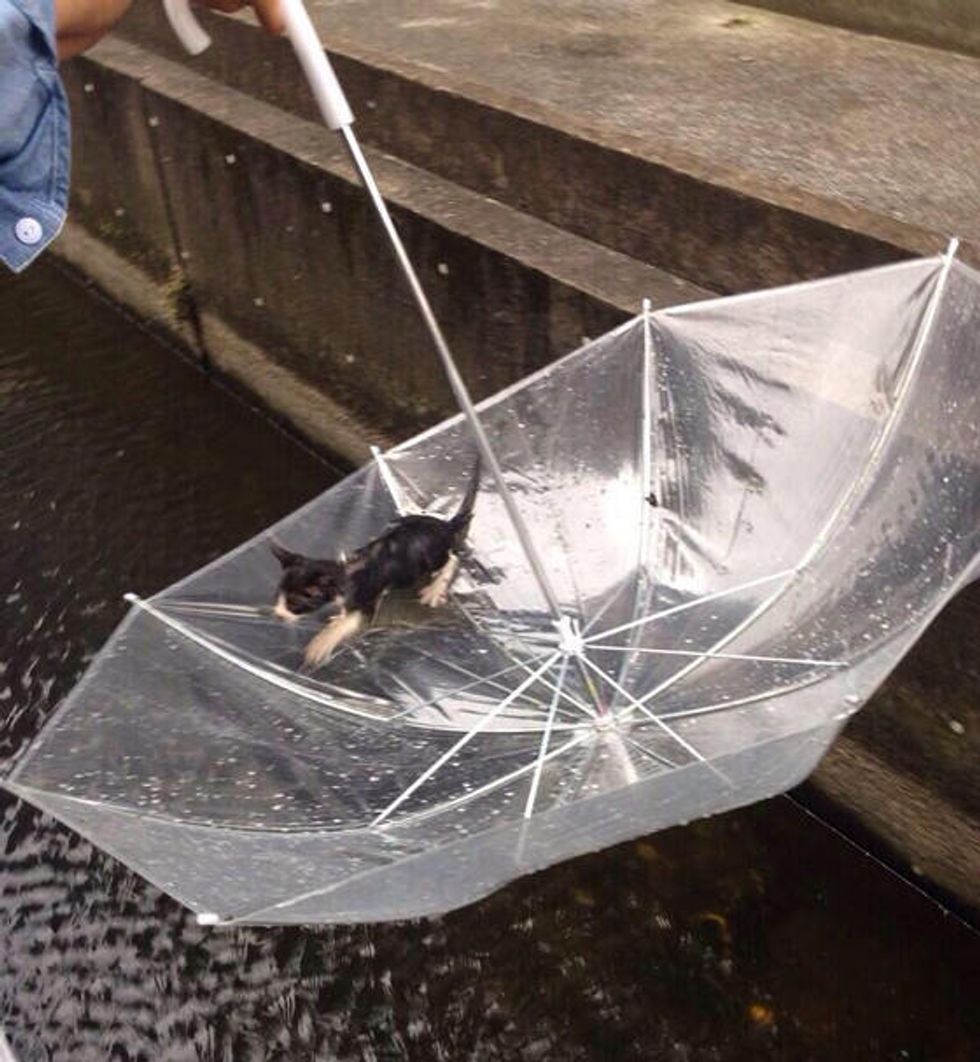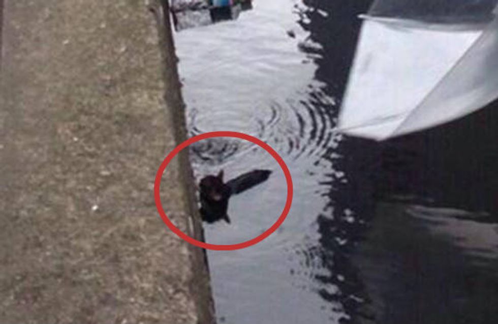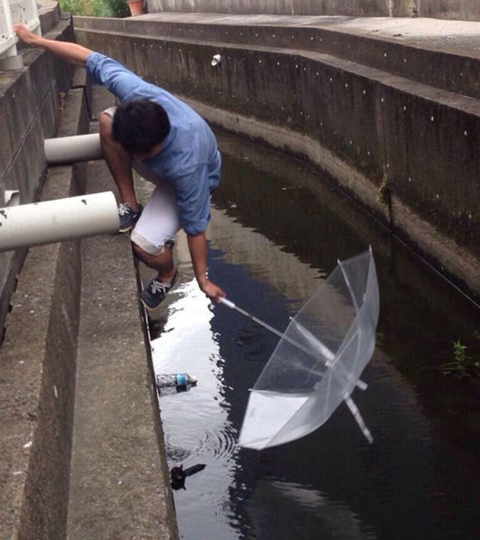 This is a heroic rescue of a young man who spotted a kitten that fell into a roadside canal and used an umbrella to quickly retrieve the kitten to safety.