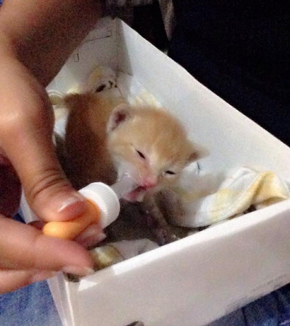 The kitten scarfed down the food and purred up a storm on the first day home.