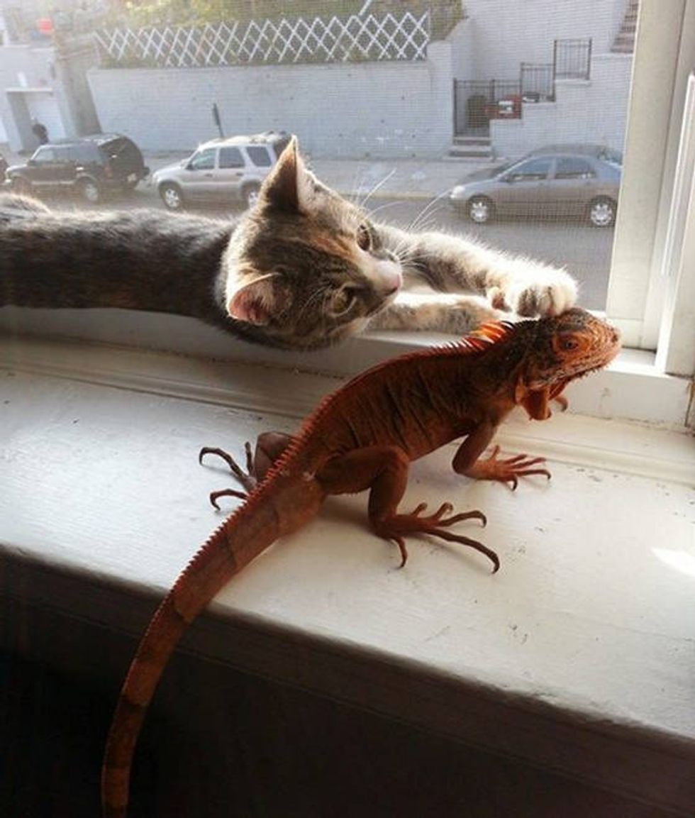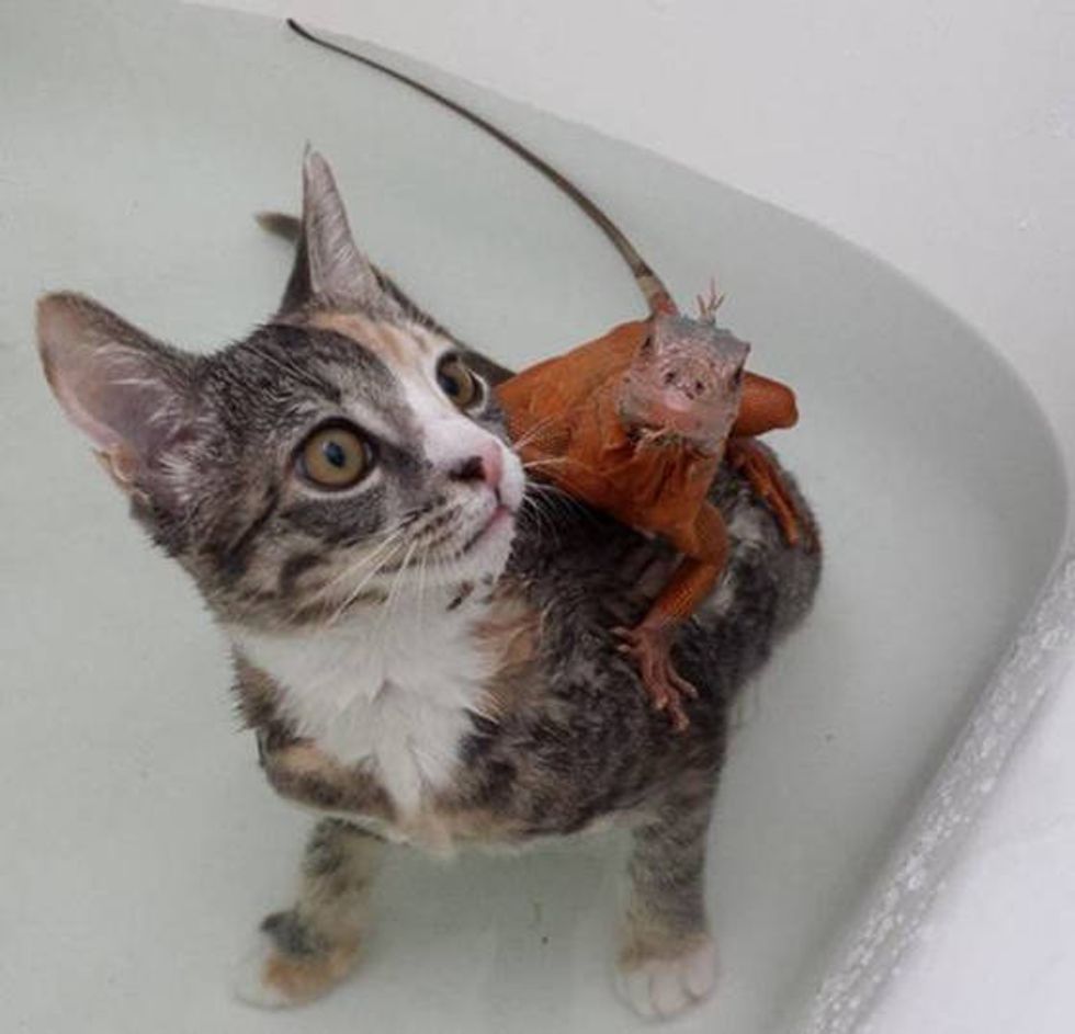 A rescue kitten finds an unlikely friend, a red iguana who doesn't seem to mind having a little feline companion.