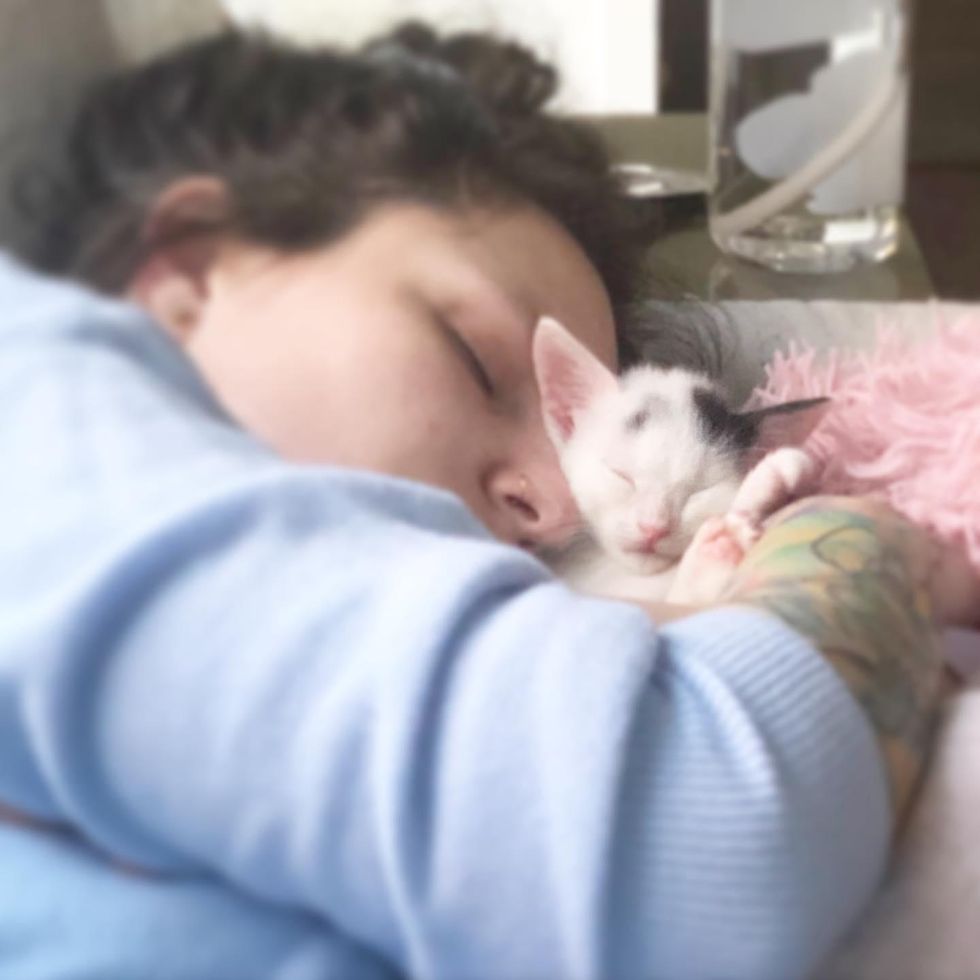Clove curled up in her foster mom's arms and purred herself to sleep.