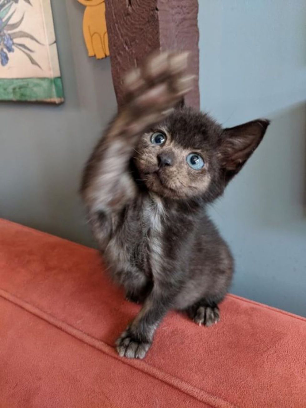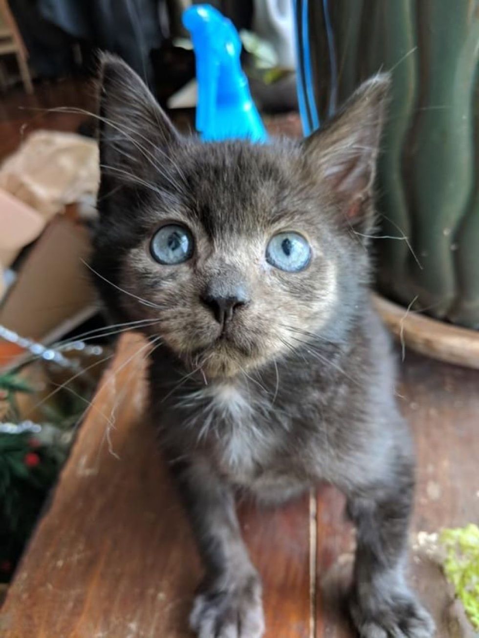 The kitten finally learned to chew her food that way. "That's when the fur started growing back in grey."