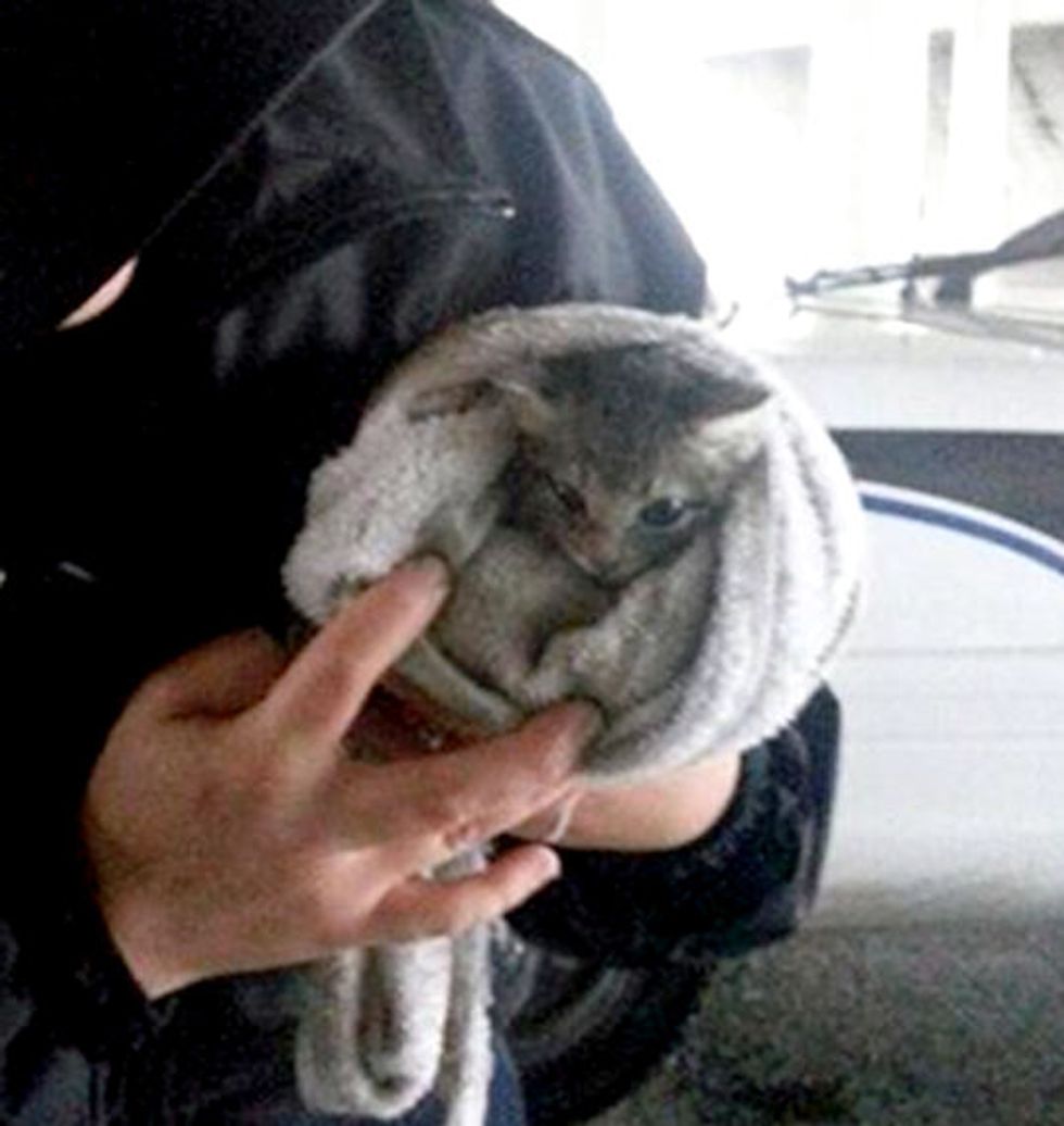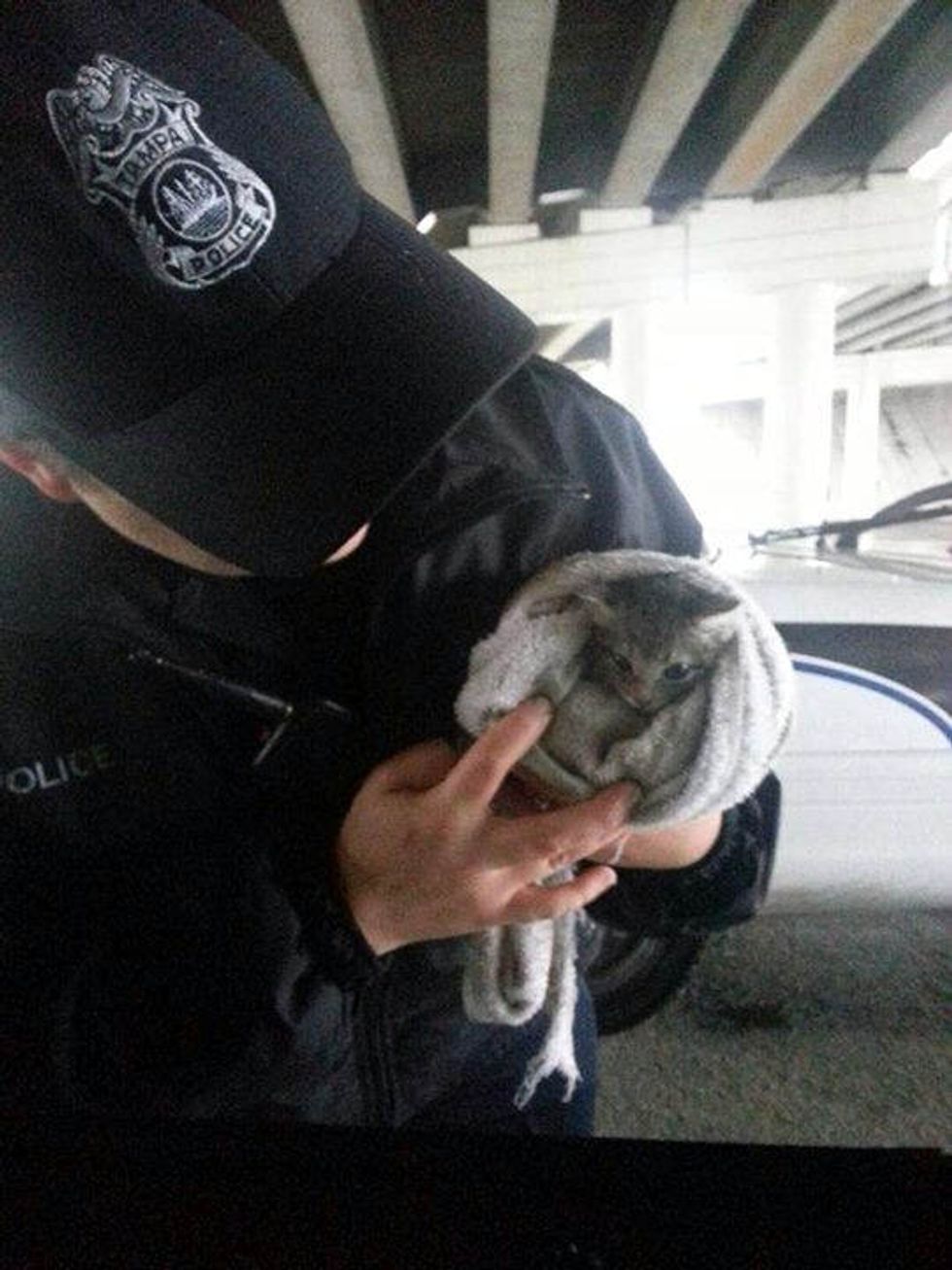 "This cute kitty was tossed from a car to a panhandler on the corner. He flagged down an officer for help. But don't worry, one of the responding officers is keeping the kitten," said Tampa Police Department on Facebook.