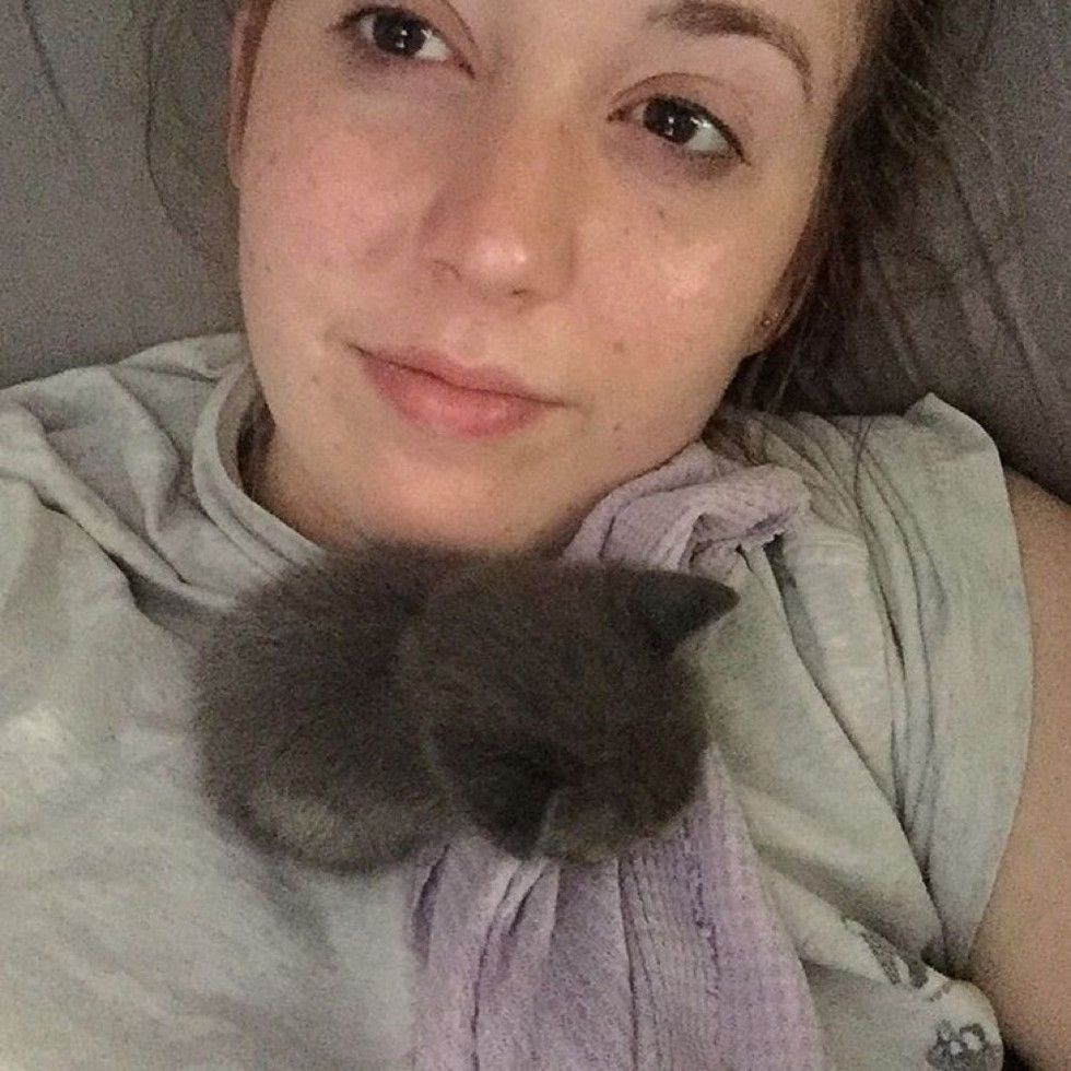 After feeding, Posy snuggles up to her human mom for a cat nap.