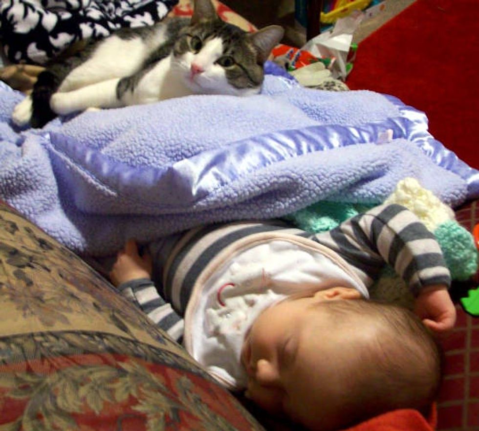 Kitty cuddling with his little human when he was still in his mama's belly.