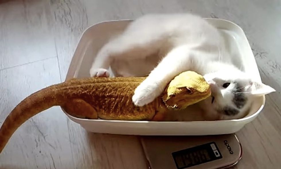 "I was trying to weigh my bearded dragon, and then kittie comes along," RL Dragons said.