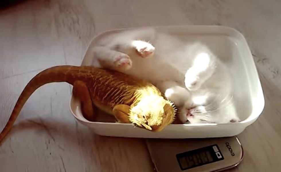 Every time they weigh their bearded dragon, their kitty hops into the scale and goes on a snuggles fest with his hairless friend.
