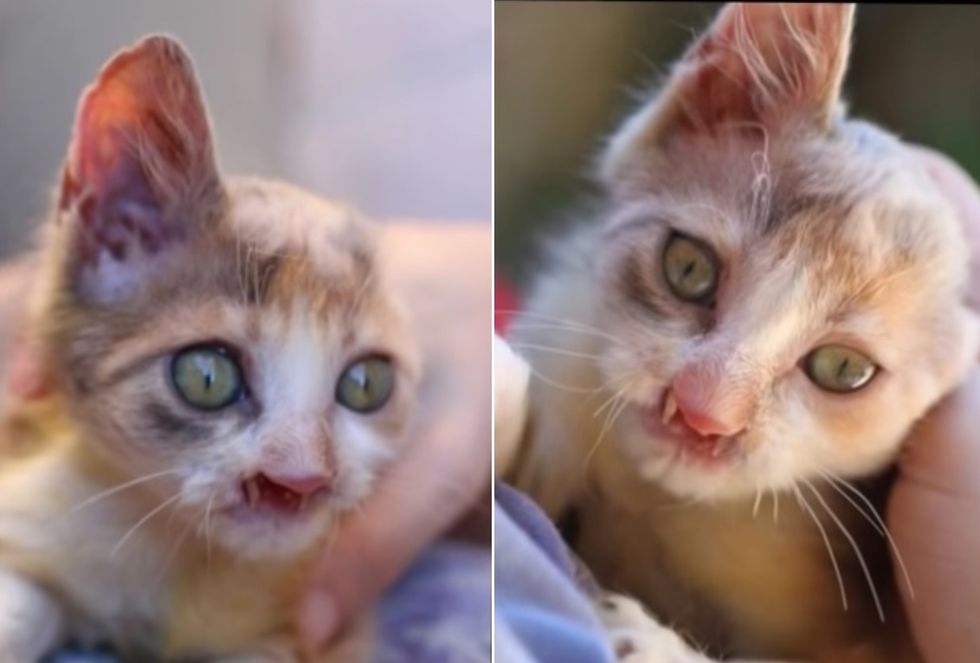 She doesn't have an upper lip and left ear, but the little kitten absolutely loves life.