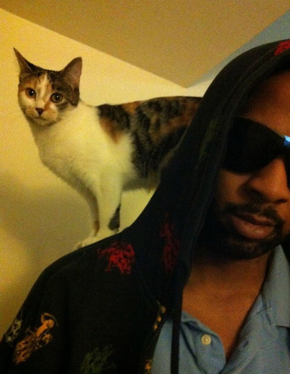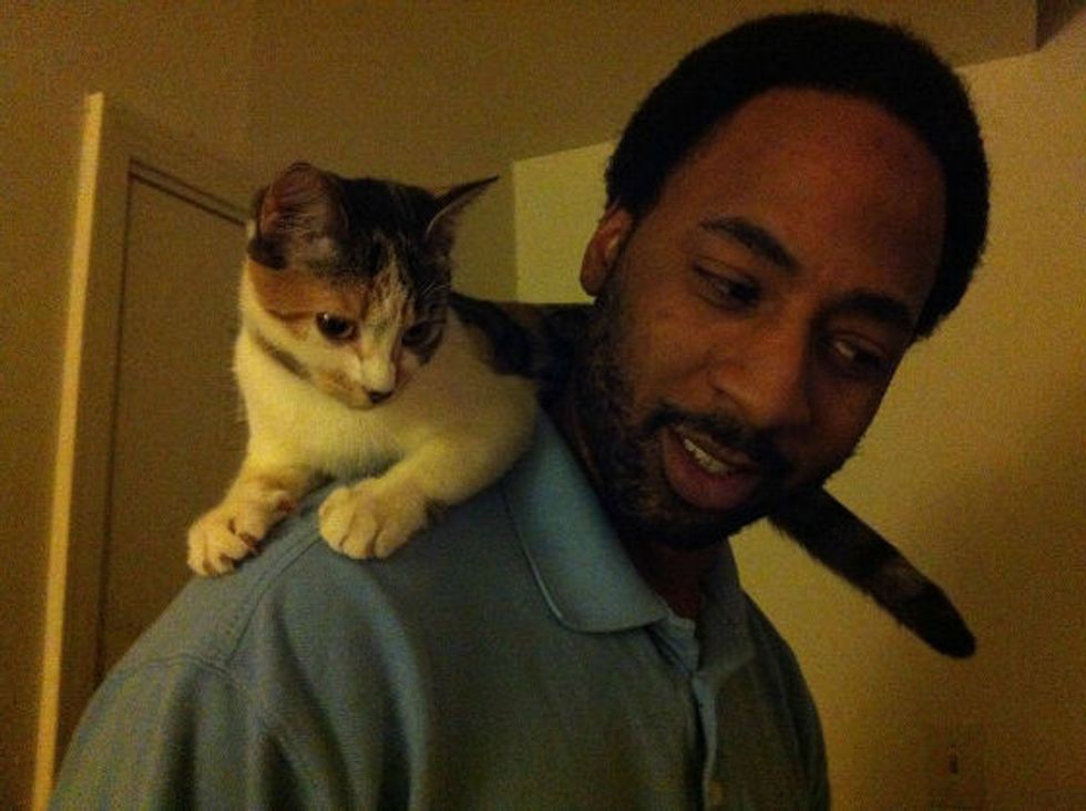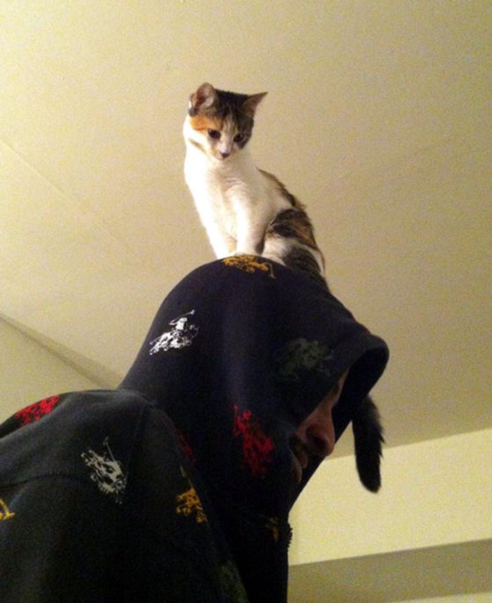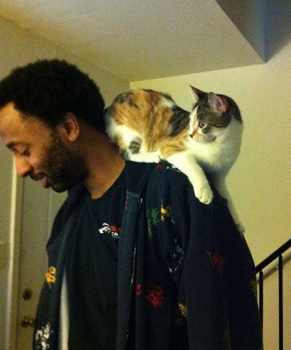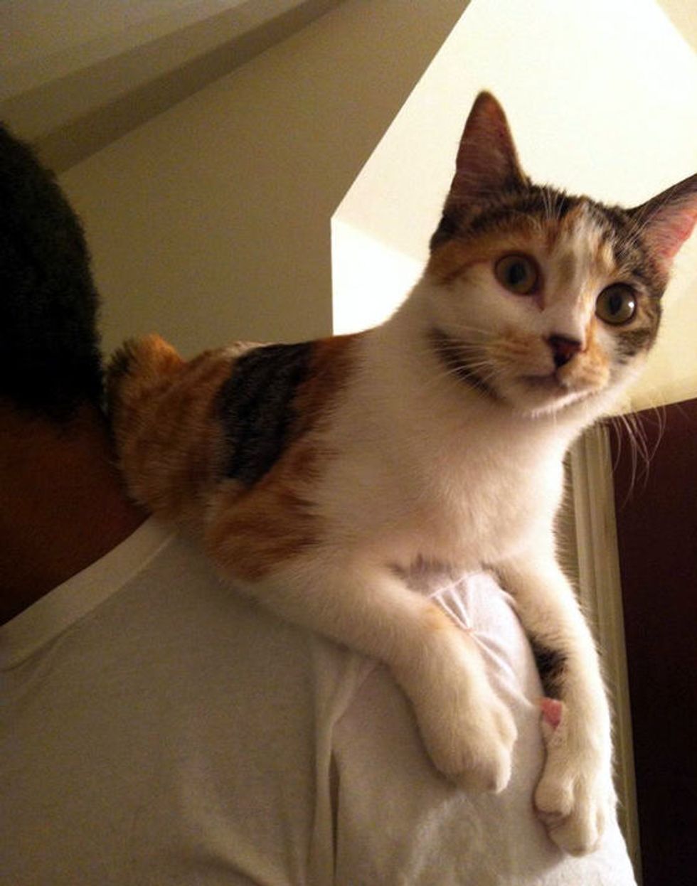 Lemon the cat loves high places and adores her human dad. This is her favorite spot to perch on.