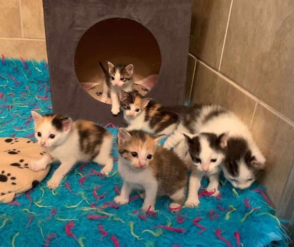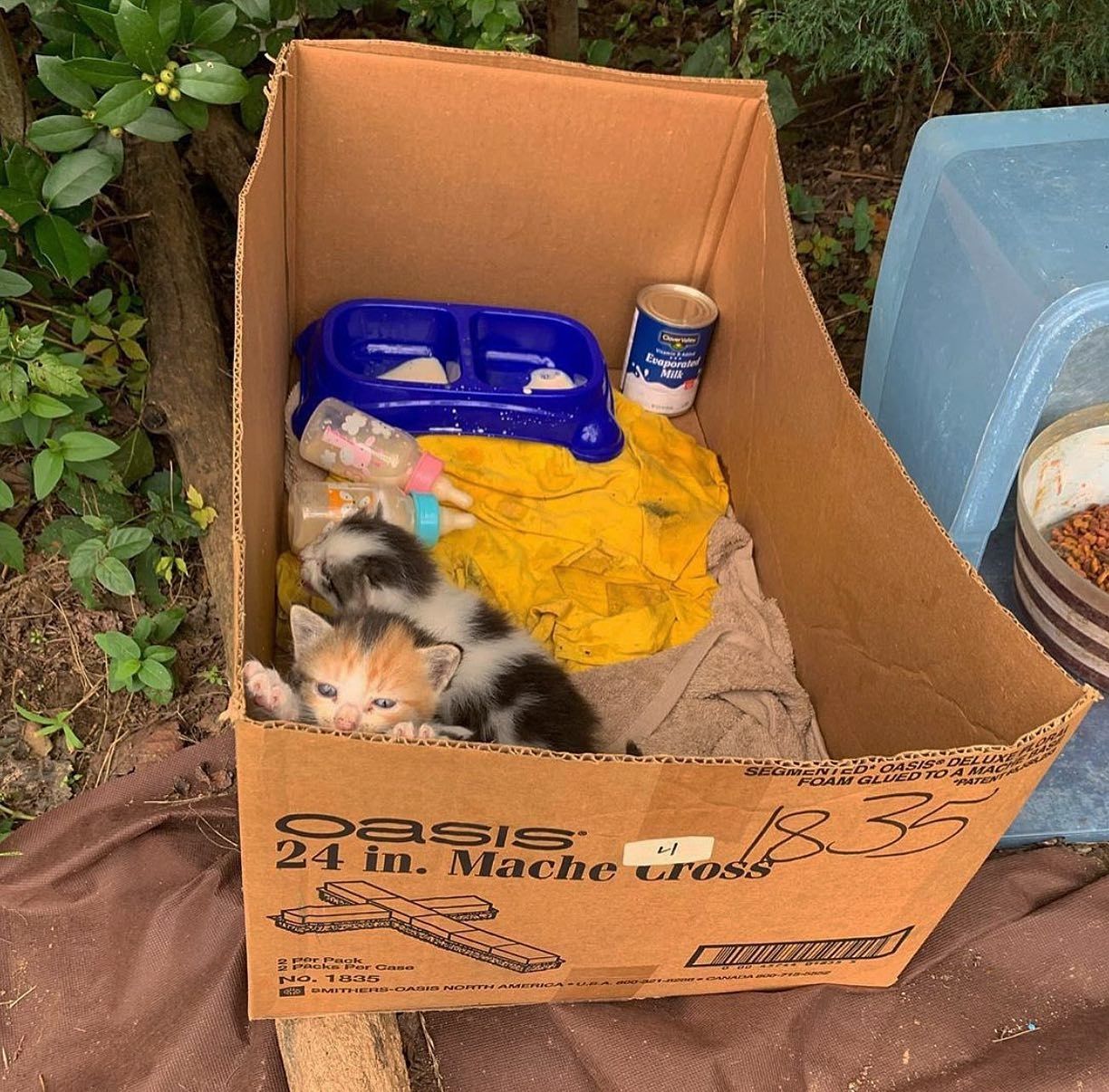 He followed the cries all the way to the back of a parking lot behind the store. Lo and behold, six kittens had been left behind in a box with infant bottles and a can of evaporated milk, which is not suitable for cats and kittens.