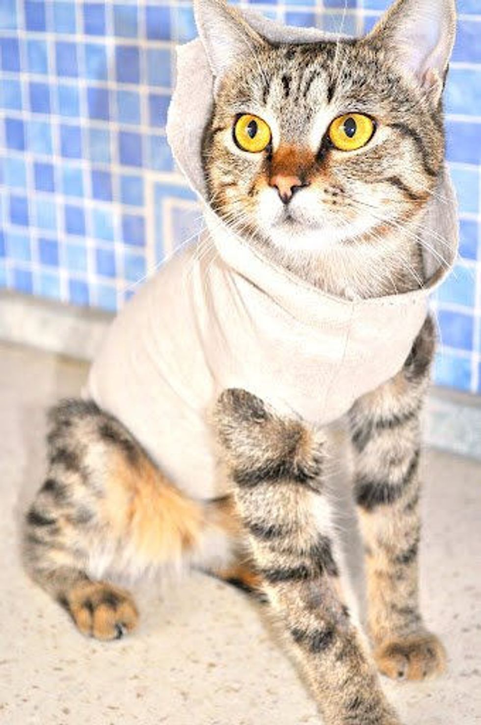They took him to a special vet. The surgery lasted for 3 hours. Olly went home in a cone. "Olly didn't like his ruff. So we made him a sweater from my old shirts. He looked so cute. And a short time later, he felt asleep. The stitches on his chest and on his tail healed very quickly."