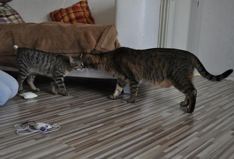 Olly came in rough shape. They weren't able to save his tail, but after many visits to the vet, Olly finally learned to walk again. "Now I was able to get him to adopt to the 929 km distants Vienna. At the first moment Olly and Coco, my other cat were acting like brothers."