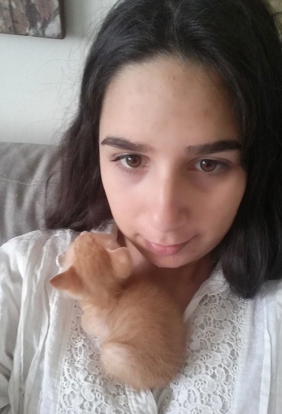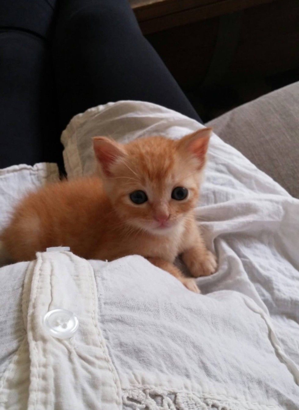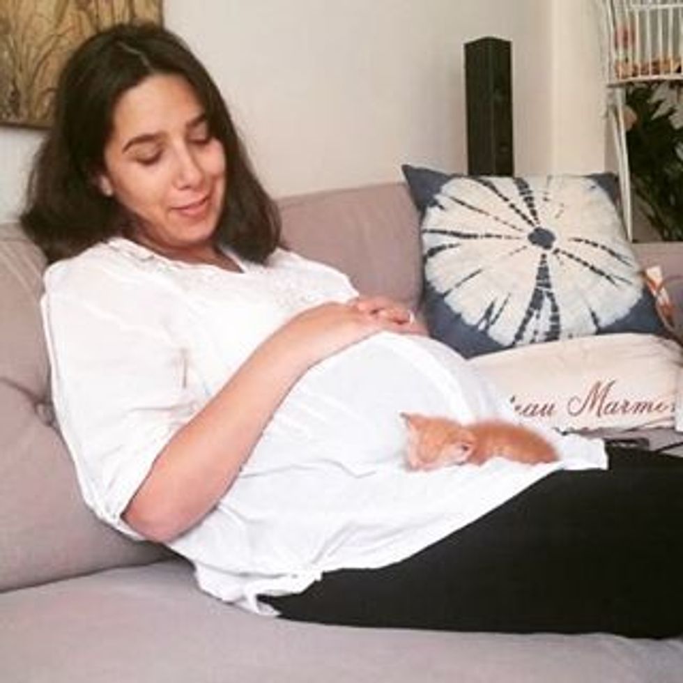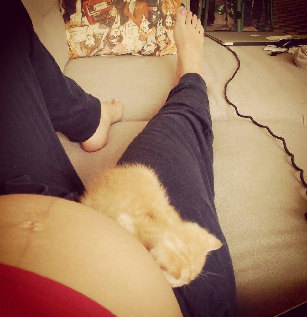A young woman found a tiny motherless kitten and saved his life. Now the little ginger boy can't stop cuddling with her and the baby in her belly.