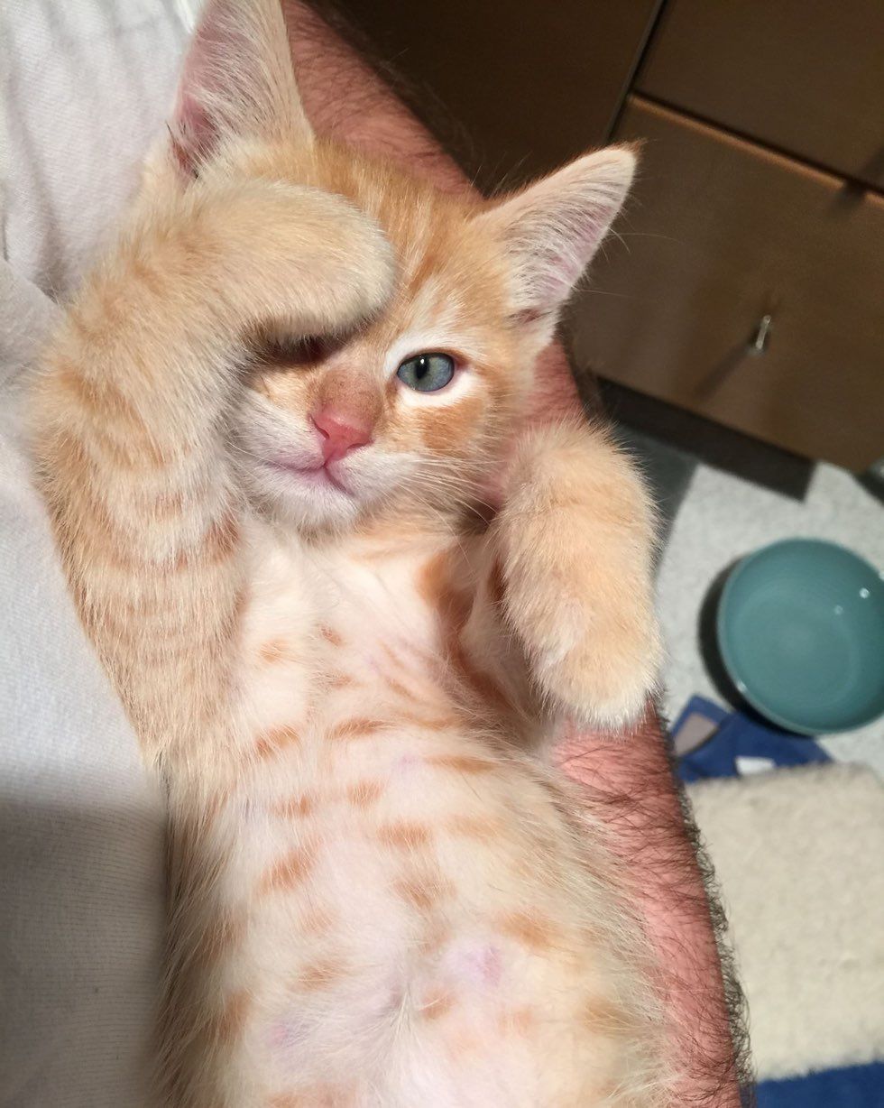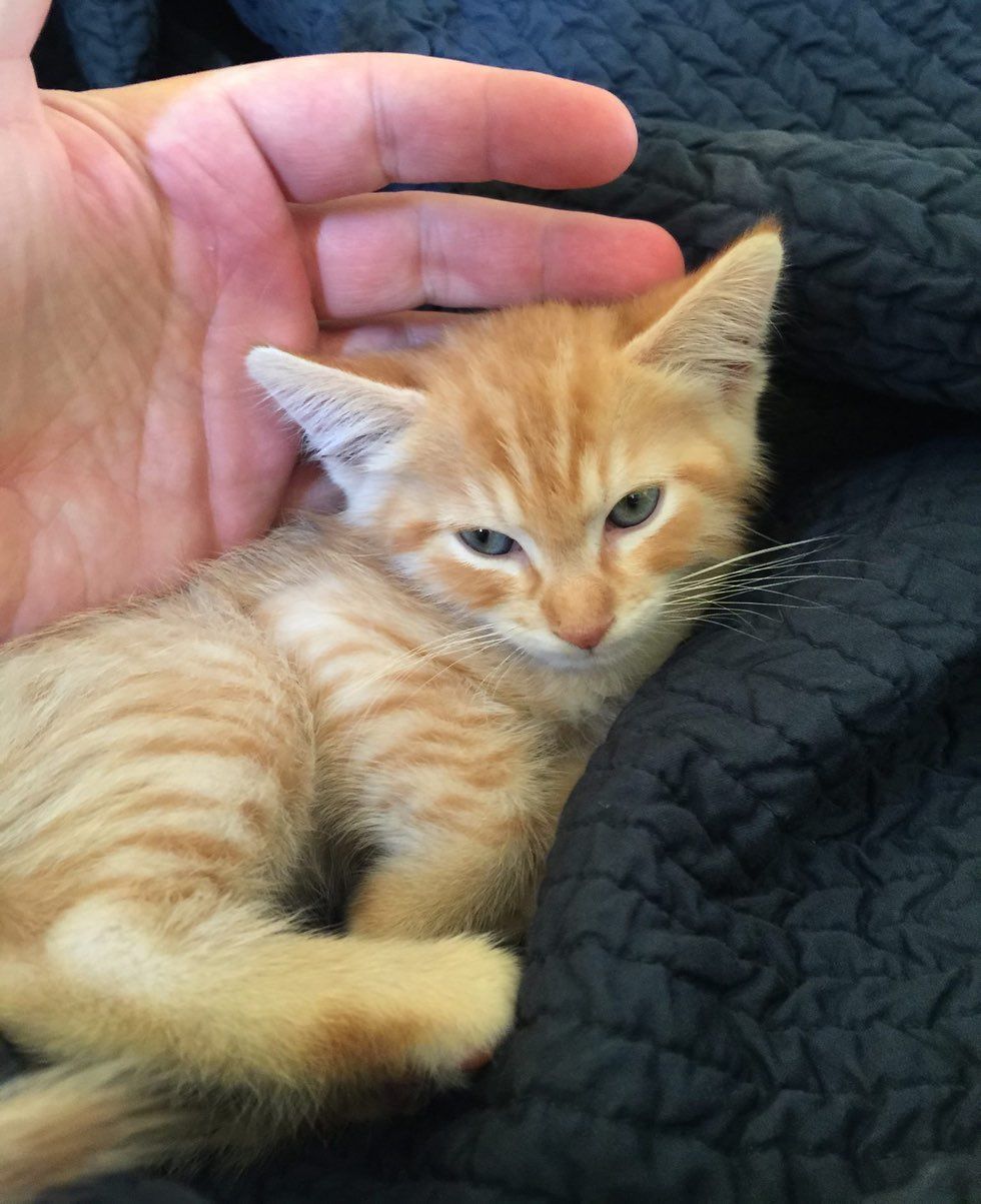 "Poor baby was hungry, he had fleas, worms, and ear mites so first we took him to the vet... He had a lot of parasites so he wasn't feeling too good and slept with us like a baby," Tronca told Love Meow.