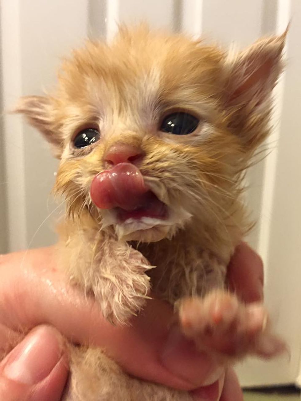 He was found wandering outside at just 2 weeks old without a mom in sight. When he was taken into Here Kitty Kitty Rescue (in Elkhart, Indiana), he barely weighed anything.